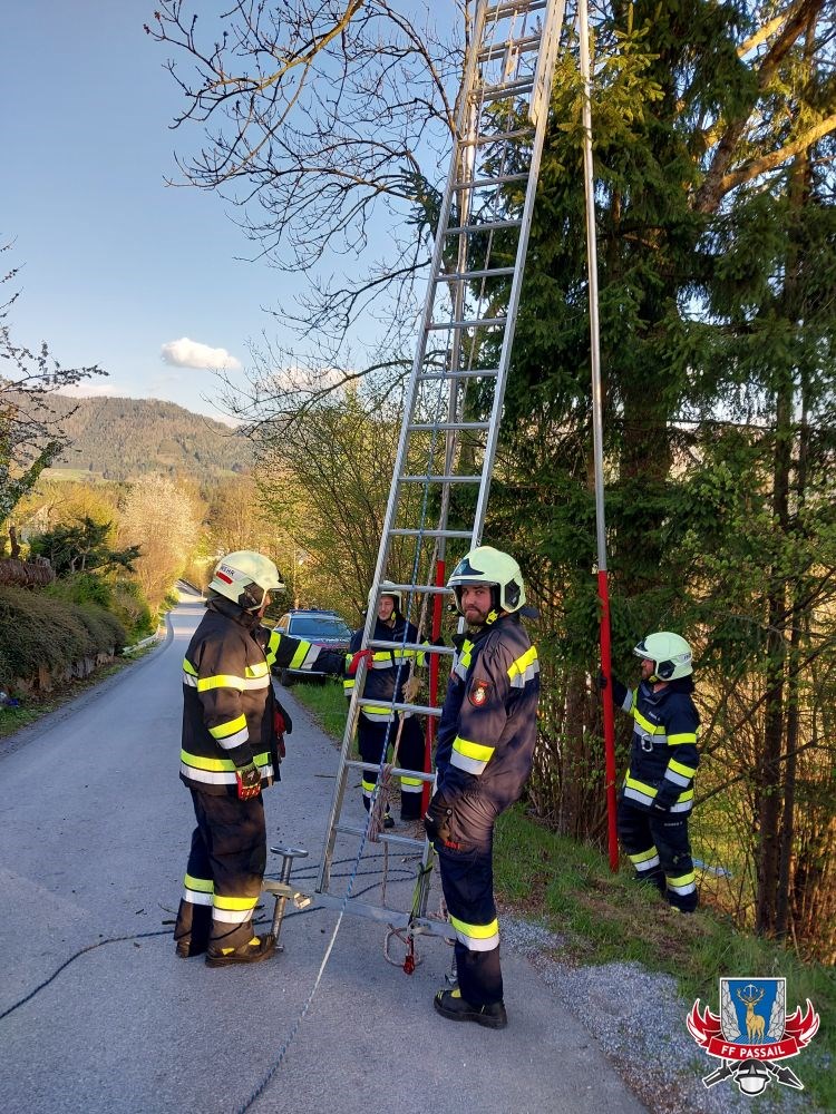 Grund der Alarmierung: Eine Katze sitzt auf ca. 17 Meter Höhe auf einem Baum fest.