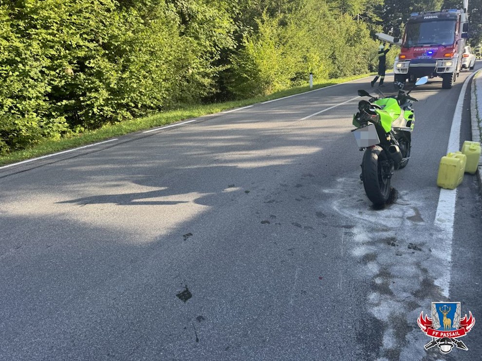 Grund der Alarmierung: Ein Motorrad kam aus ungeklärter Ursache von der Fahrbahn ab und prallte gegen eine Gehsteigkante. Betriebsmittel treten aus.
