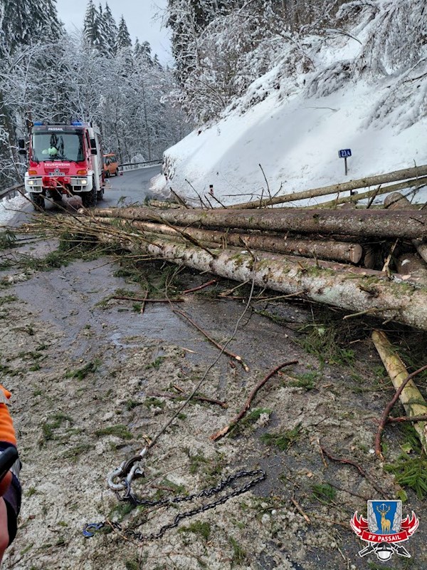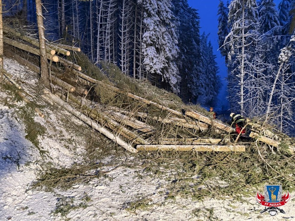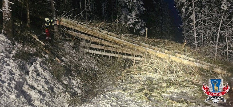 Grund der Alarmierung: Durch den Schneefall stürzten mehrere Bäume auf die Fahrbahn.