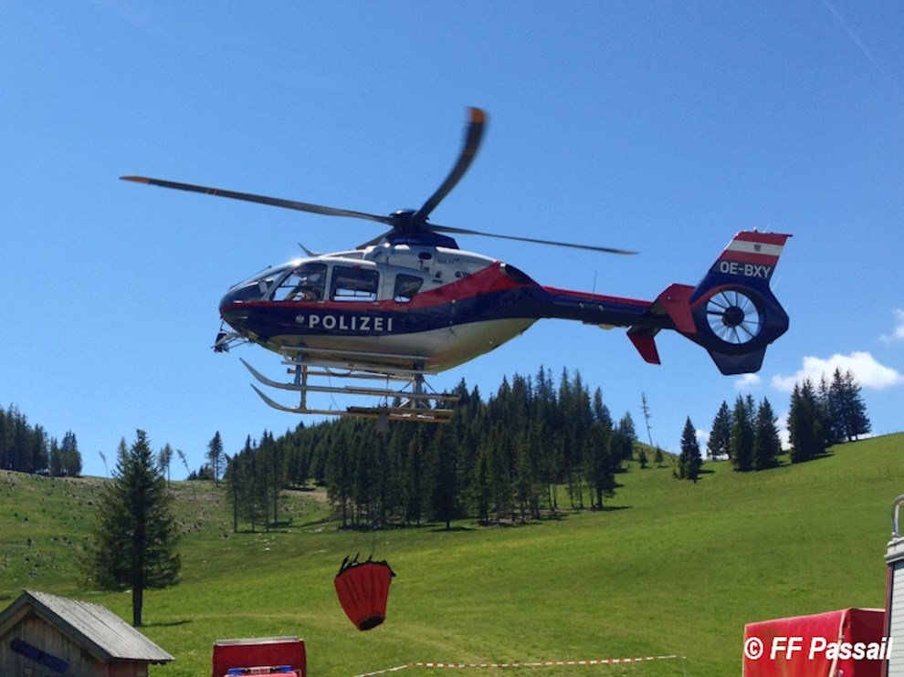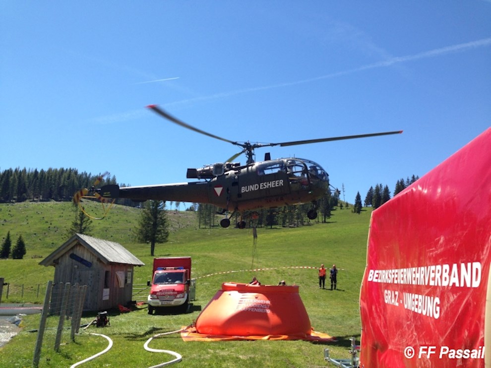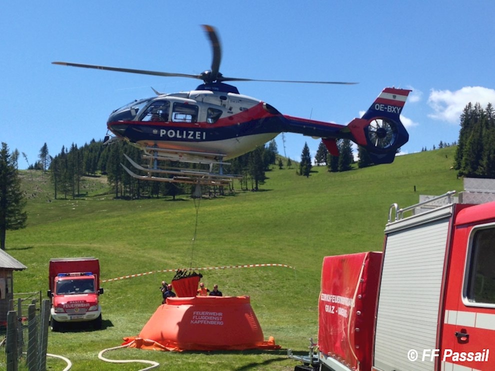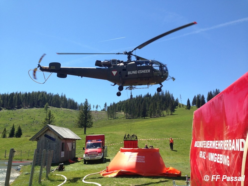 An der Nordseite des Schrottenkogels hatten die Flughelfer einige Aufgaben zu bewältigen. Sowohl das Personal als auch das benötigte Material wurde von den beiden Hubschraubern dorthin transportiert und zurückgeflogen. Zwischendurch wurde von beiden Hubschraubern der Wassertransport mit dem Bambi-Bucket beübt.