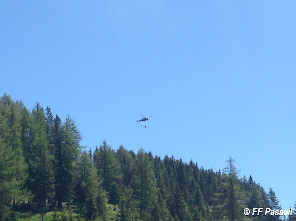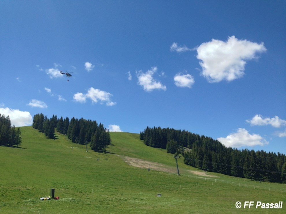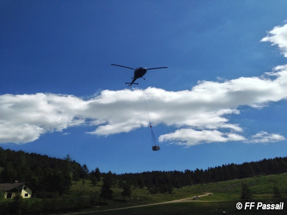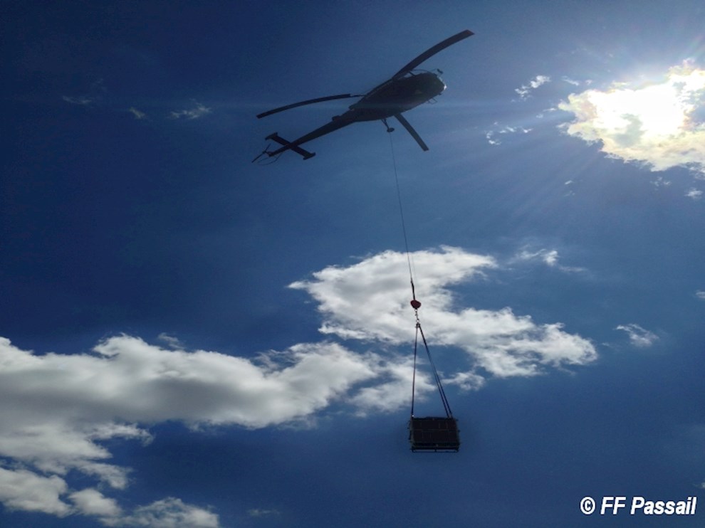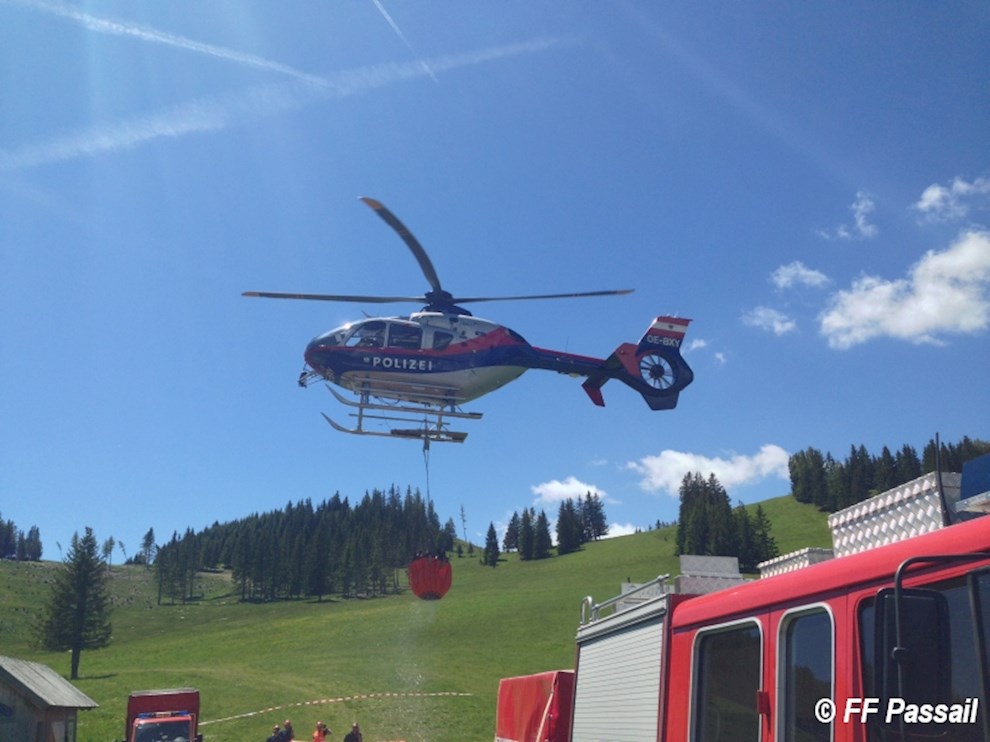 An der Nordseite des Schrottenkogels hatten die Flughelfer einige Aufgaben zu bewältigen. Sowohl das Personal als auch das benötigte Material wurde von den beiden Hubschraubern dorthin transportiert und zurückgeflogen. Zwischendurch wurde von beiden Hubschraubern der Wassertransport mit dem Bambi-Bucket beübt.