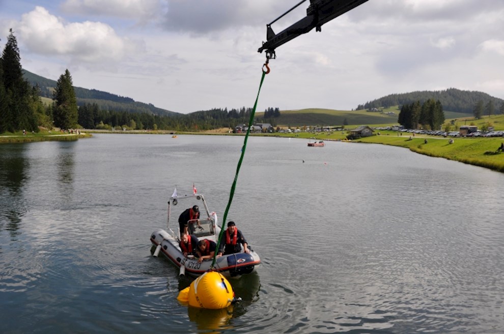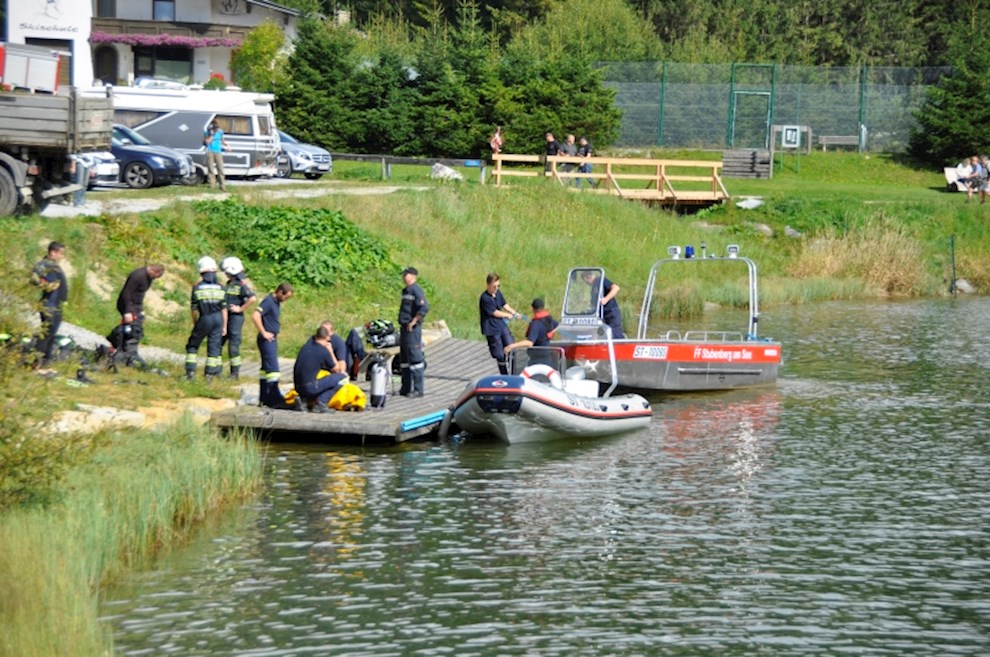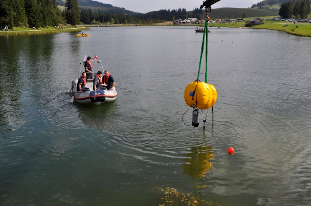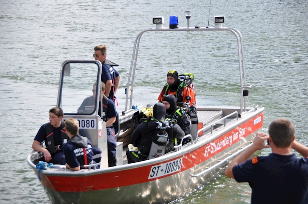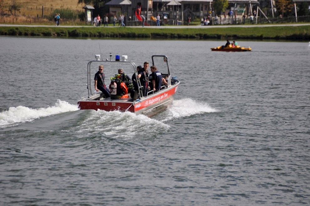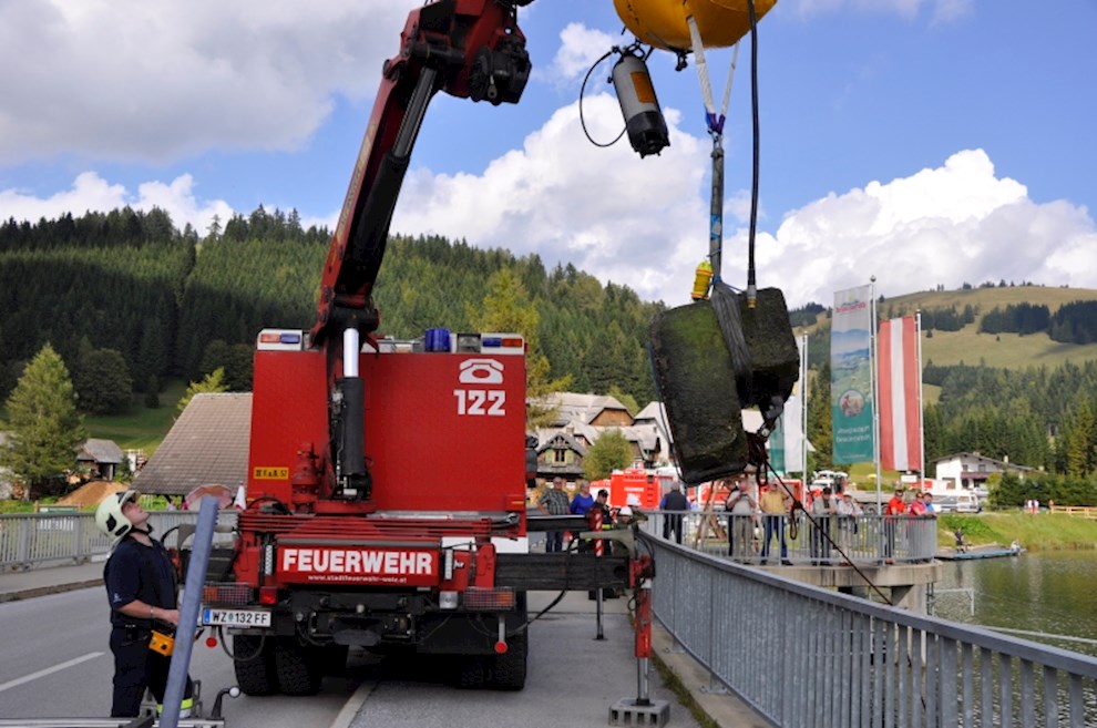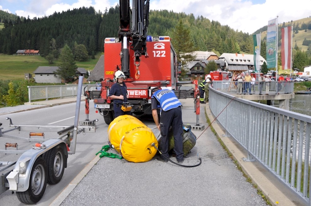 Zeitgleich mussten die Taucher des BFV Weiz, der FF Stubenberg/See und FF Fürstenfeld dem in den See gestürzten Motor (Übungsobjekt war ein Traktorgewicht) aus dem See tauchen.