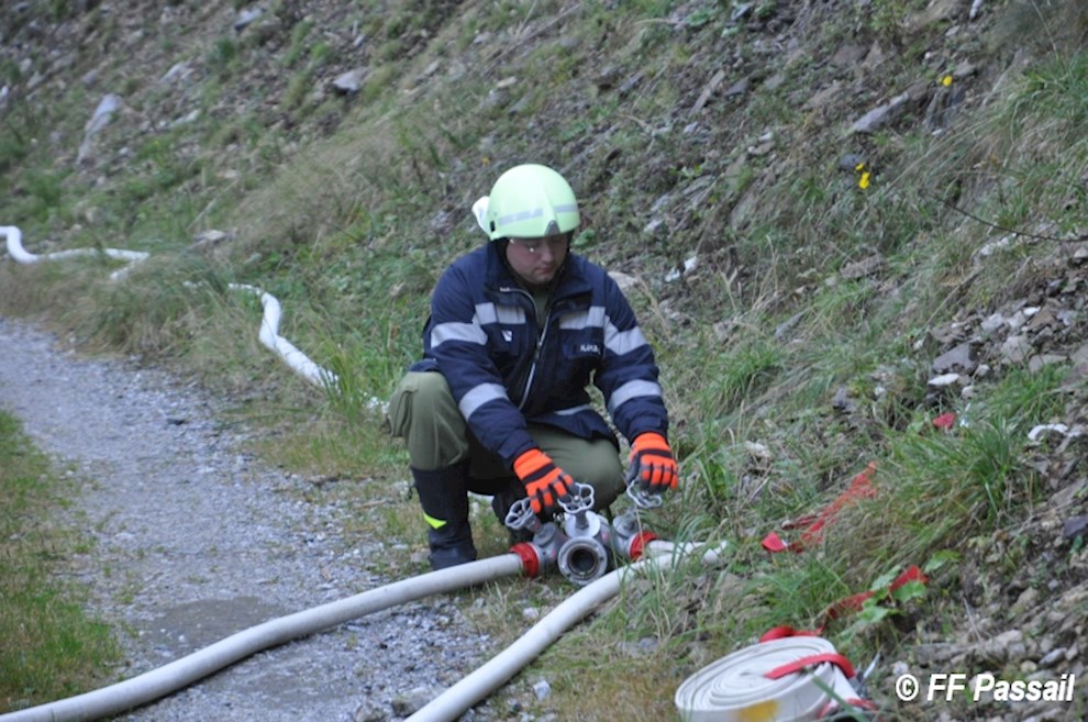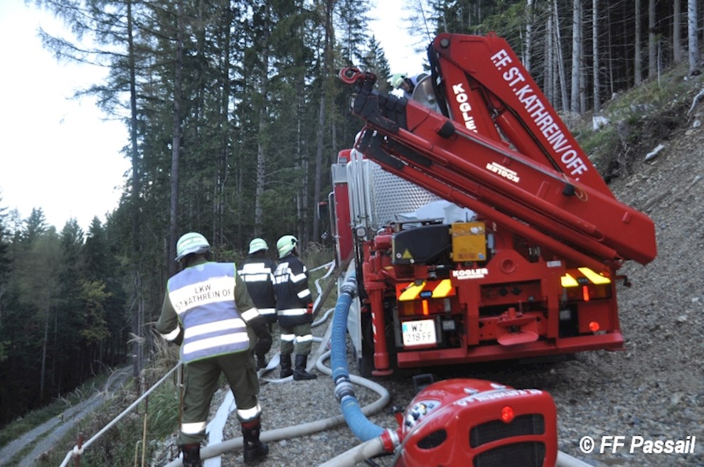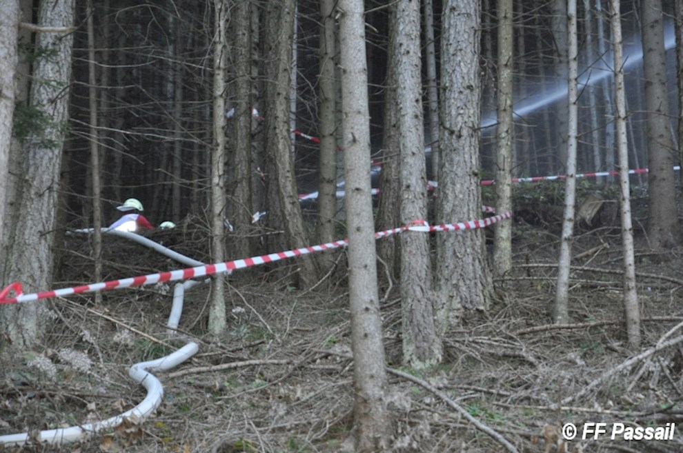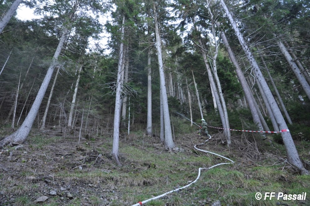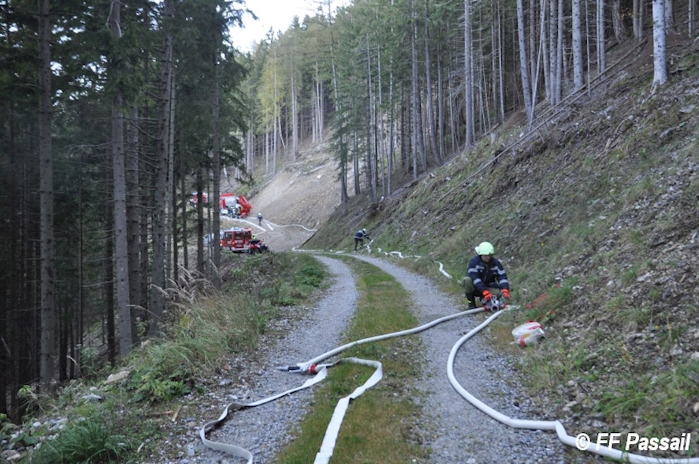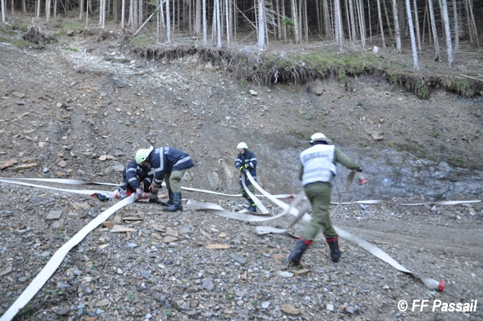 Nachdem die Zubringleitung um 10:42 Uhr fertiggestellt wurde, kam um 10:53 Uhr erstmals Wasser am Einsatzort an. Nach einigen Unterbrechungen wegen Schlauchplatzern und defekten Pumpen, wurde anschließend mit 6 Pumpen bei einem Höhenunterschied von ca. 120 m bis etwa 13:20 Uhr Löschwasser gefördert. Die Brandbekämpfung erfolgte durch 3 C-Rohre und 1 B-Rohr. Bei einer Unterweisung in die Waldbrandbekämpfung durch HBI Gerald Edlinger hatten einige Kameraden die Möglichkeit, sich neues Wissen anzueignen.