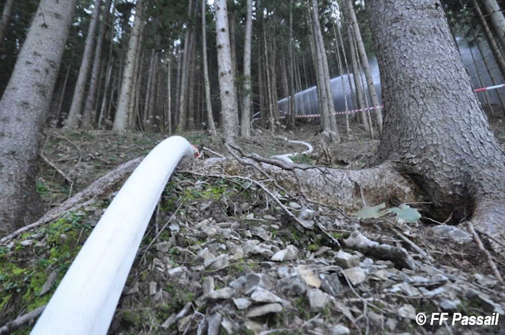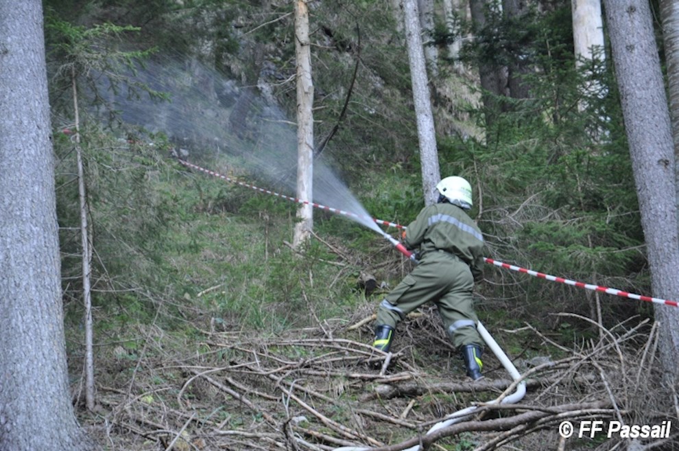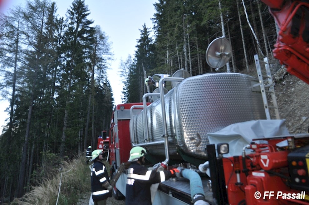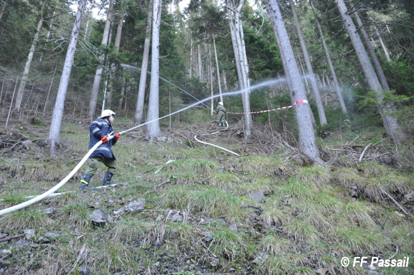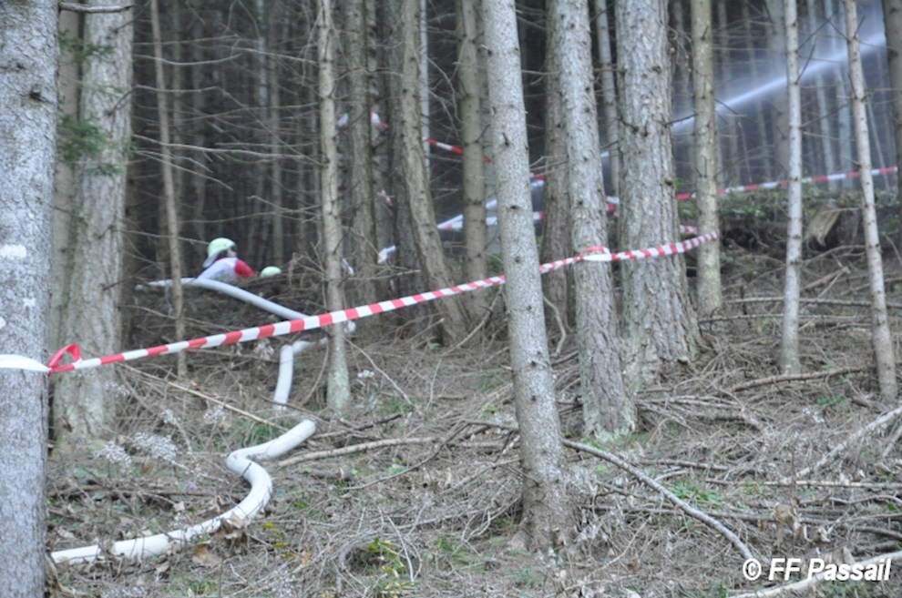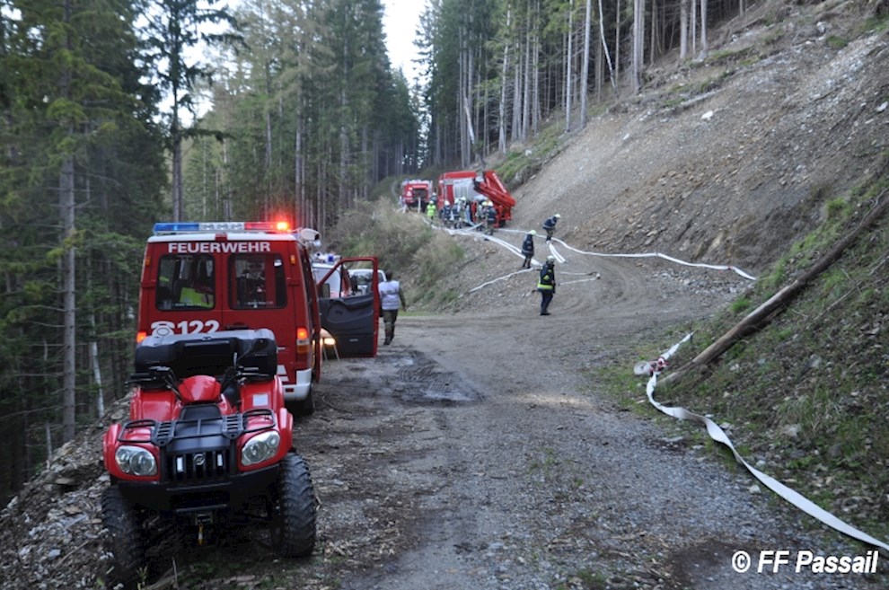 Nachdem die Zubringleitung um 10:42 Uhr fertiggestellt wurde, kam um 10:53 Uhr erstmals Wasser am Einsatzort an. Nach einigen Unterbrechungen wegen Schlauchplatzern und defekten Pumpen, wurde anschließend mit 6 Pumpen bei einem Höhenunterschied von ca. 120 m bis etwa 13:20 Uhr Löschwasser gefördert. Die Brandbekämpfung erfolgte durch 3 C-Rohre und 1 B-Rohr. Bei einer Unterweisung in die Waldbrandbekämpfung durch HBI Gerald Edlinger hatten einige Kameraden die Möglichkeit, sich neues Wissen anzueignen.
