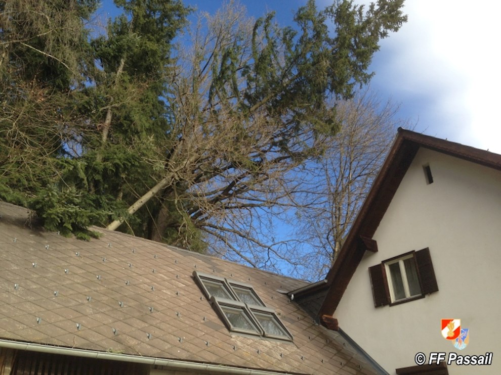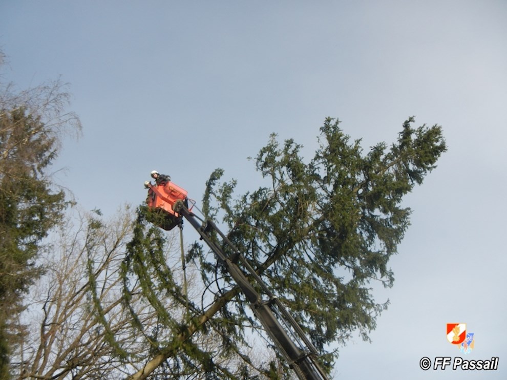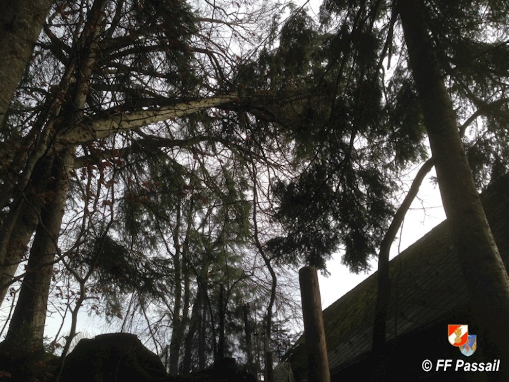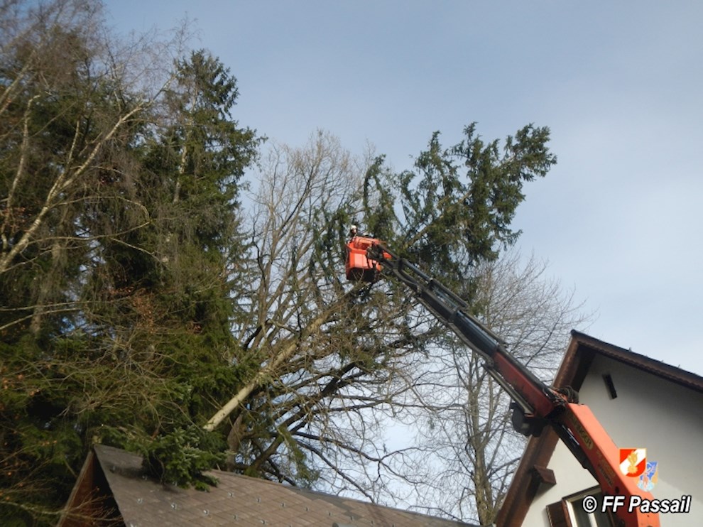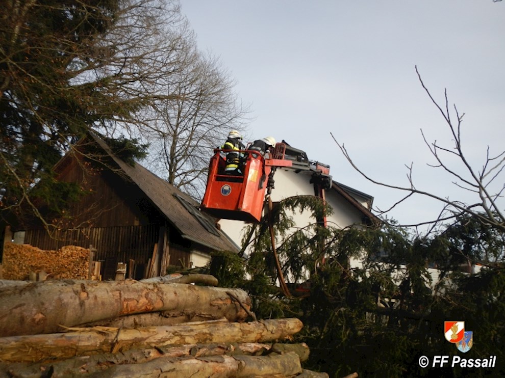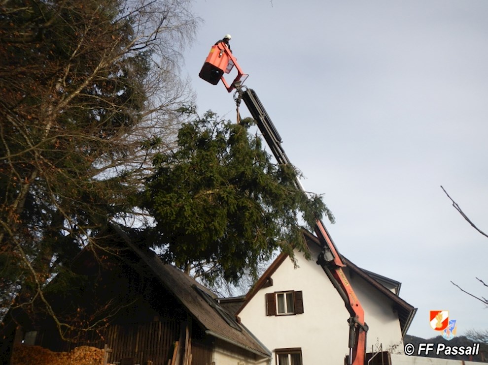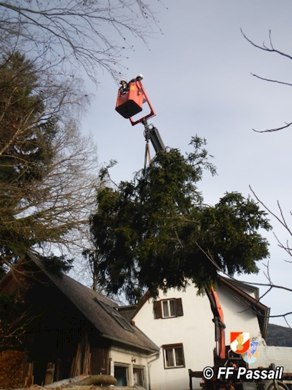 Am 10.1.2015 wurde die FF Passail um 11:34 Uhr per Sirene zu einer Baumbergung in Auen alarmiert. Ein Baum drohte auf ein Haus zu stürzen.