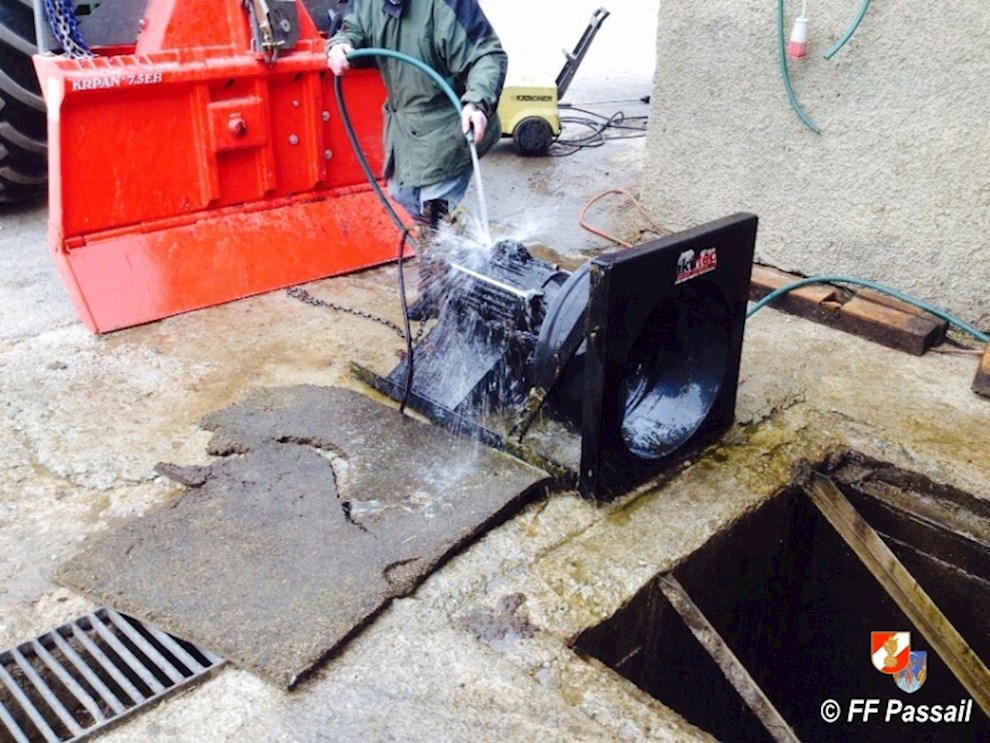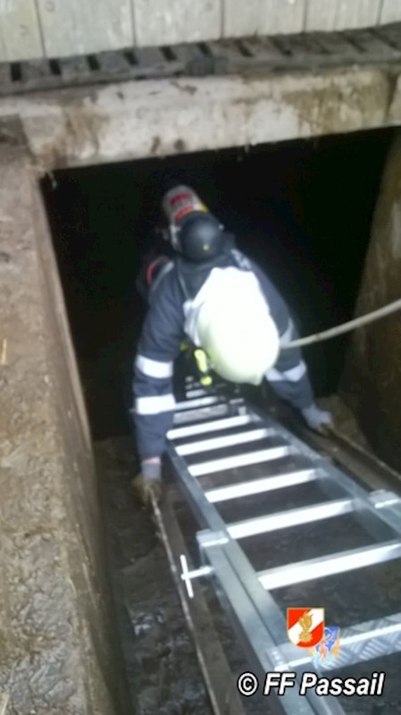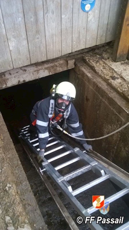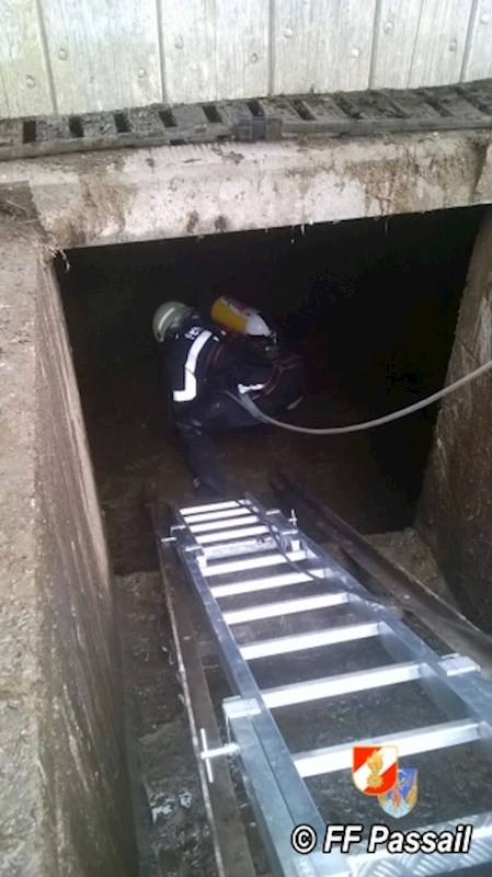 Zuerst wurde mittels Gasmessgerät die Zusammensetzung der Luft in der Güllegrube gemessen, woraufhin der schwere Atemschutz aufgenommen wurde. Durch einen Auffanggurt und eine Rettungsleine gesichert wurde dann über eine Steckleiter in die Grube vorgegangen. Am Mixer wurde eine Kette befestigt, mit der er dann von einer Seilwinde an die Oberfläche gezogen werden konnte.