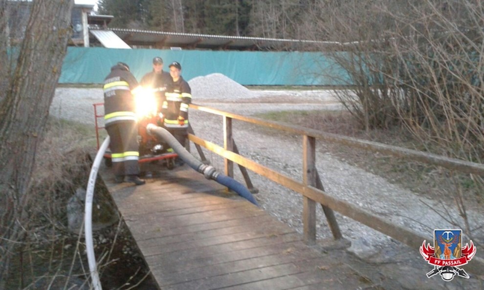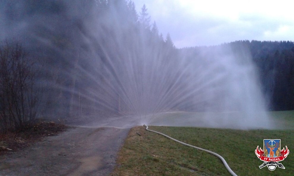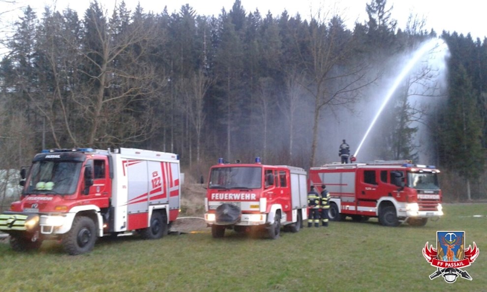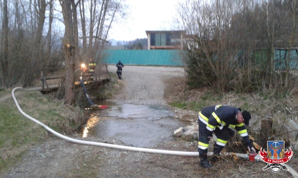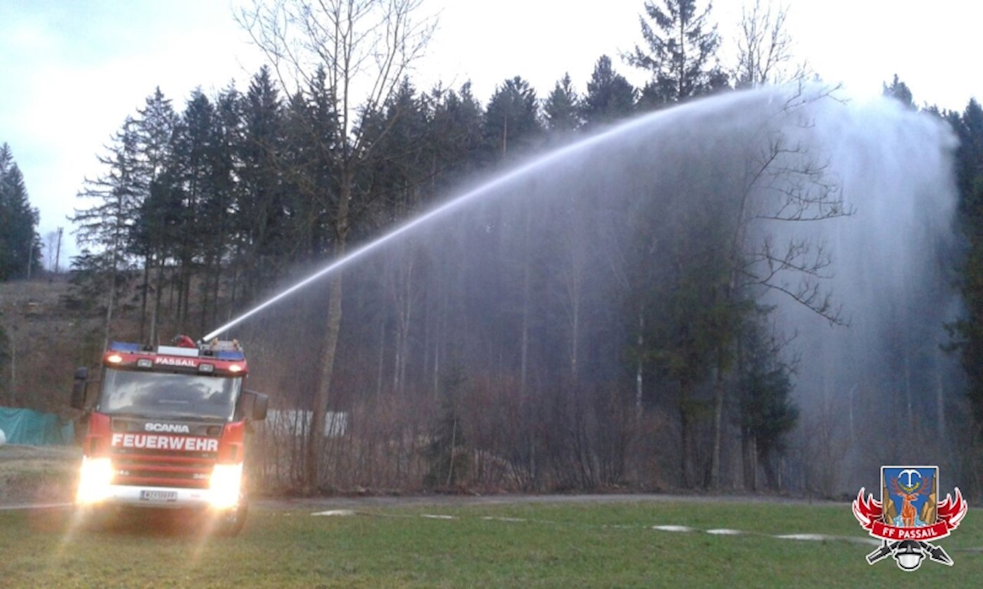 Der Wasserbezug wurde vom Griesbach hergestellt, wo mit unserer Rosenbauer FOX II TS 12 und einem Flachsauger angesaugt wurde. Damit wurde der TLFA 4000 gespeist, der einen Wasserwerfer bzw. ein Hydroschild versorgte. Der richtige Umgang mit großen Wasserverbrauchern als Maschinist und die richtige Bemessung von Löschmitteln ist bei Einsätzen sehr wesentlich, da das Löschwasser oft mühsam über längere Strecken mit Zubringleitungen gepumpt oder durch einen TLF-Pendelverkehr herangeschafft werden muss.