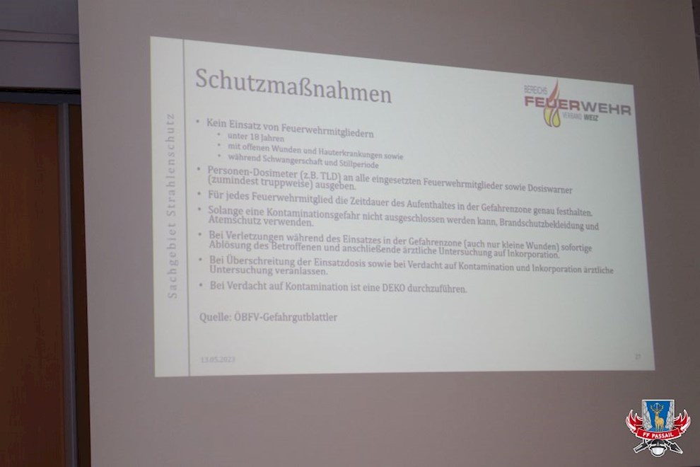 Den Übungsabschluss bildete eine gemeinsame Nachbesprechung, bei der die gewonnenen Erkenntnisse nochmals wiederholt wurden und die sehr gute Zusammenarbeit bekräftigt wurde. Insgesamt nahmen 16 Kamerad*innen aus den Feuerwehren Gleisdorf (DEKO-Stützpunkt), Passail (Strahlenschutz-Stützpunkt), Weiz (Strahlenschutz-Spürtrupp) und Strallegg an der Übung teil.