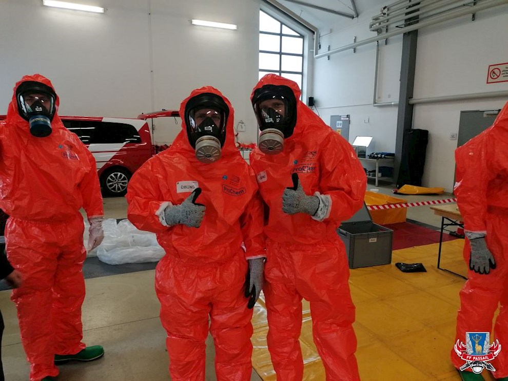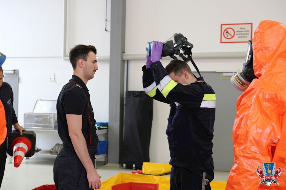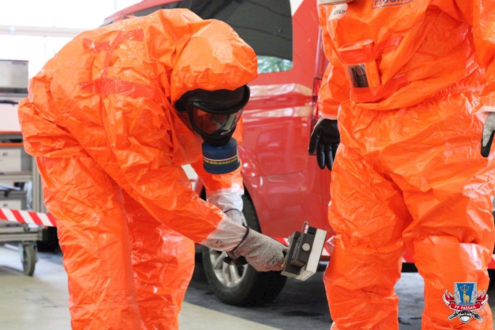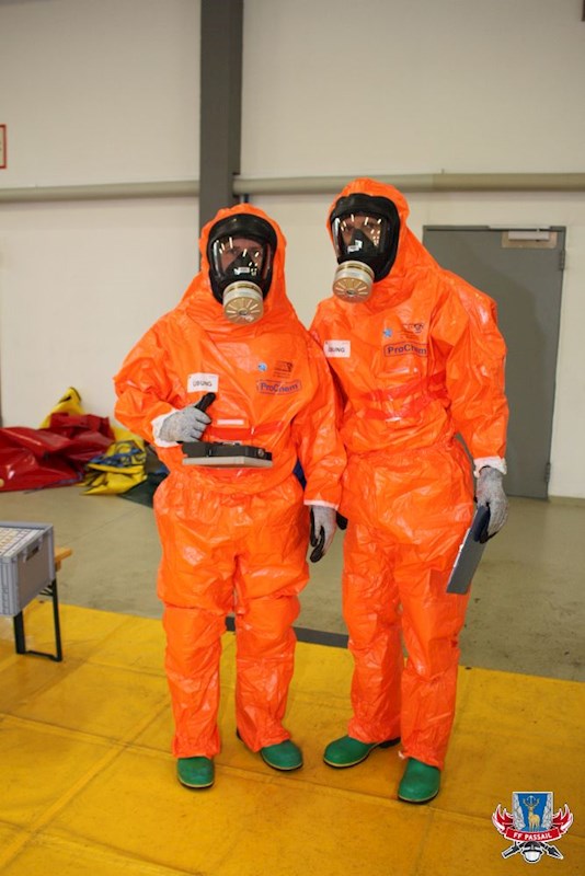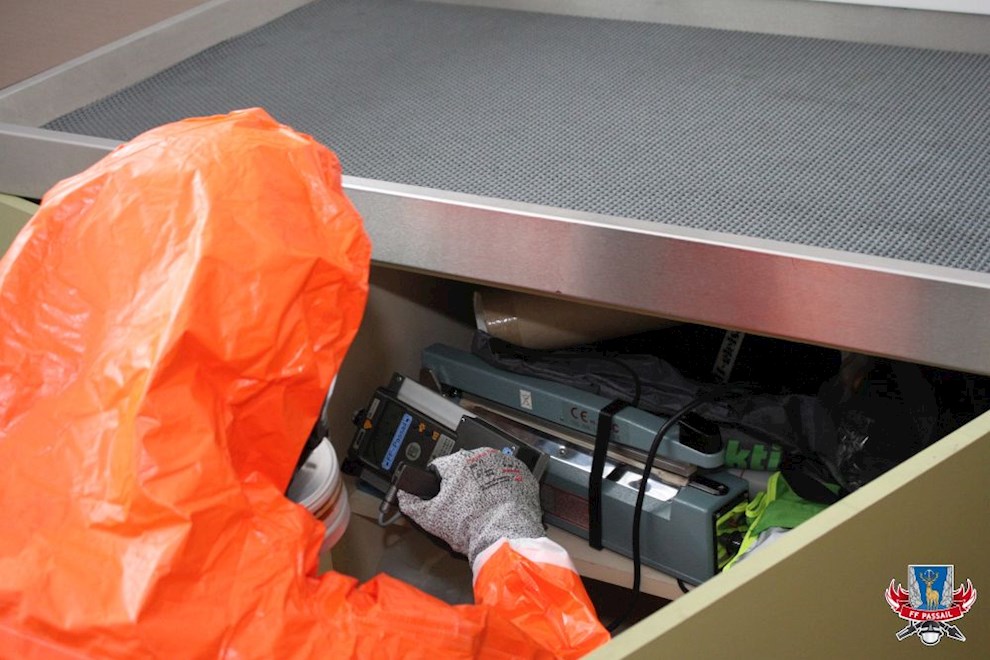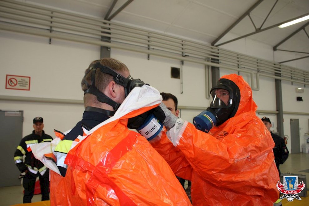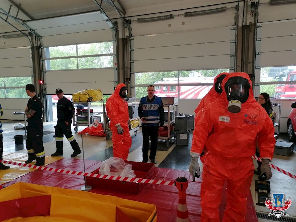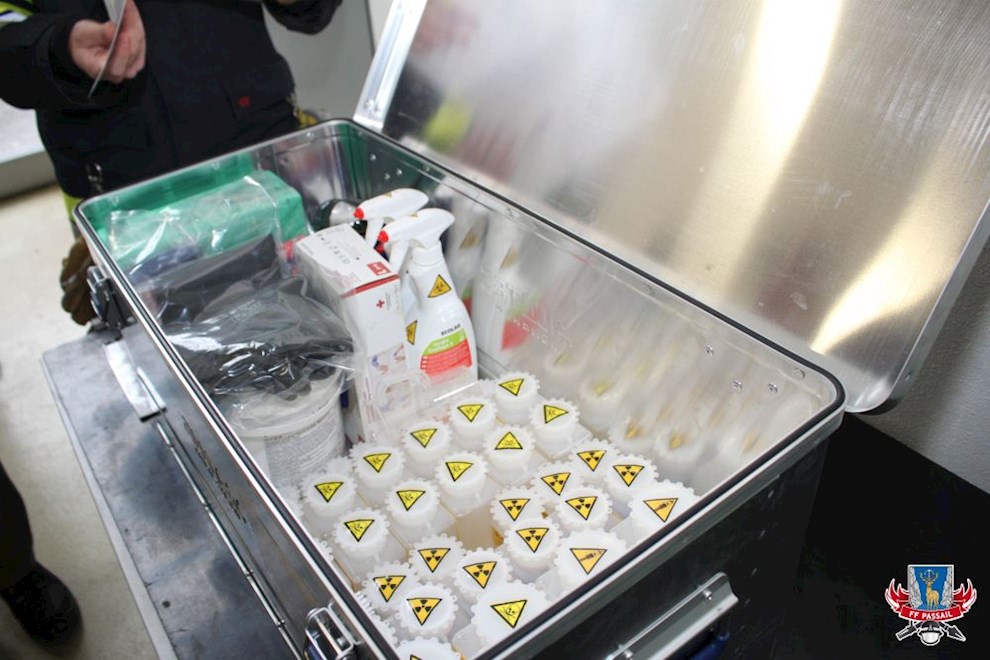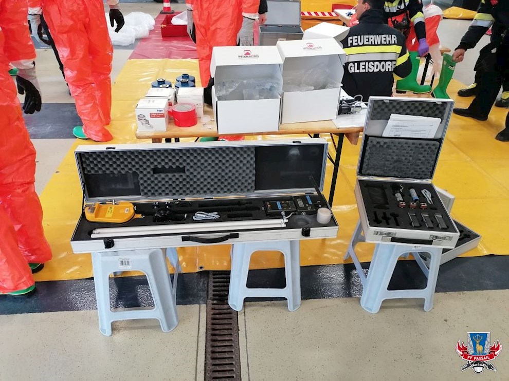 Übungsannahme war ein Laborbrand mit radioaktiven Stoffen. Zwei Strahlenspürtrupps rüsteten sich daraufhin mit Schutzanzügen und Atemschutzmasken sowie den notwendigen Messgeräten aus. Ein weiterer Spürtrupp übernahm die Tätigkeiten in der DEKO-Straße.