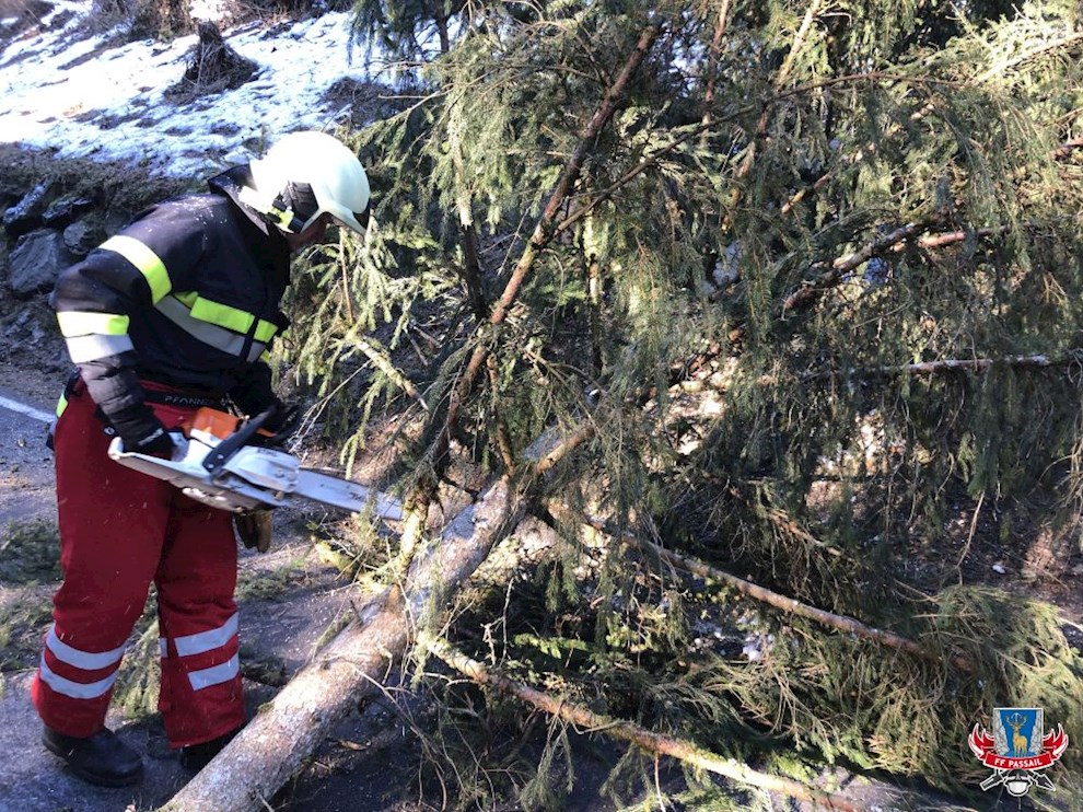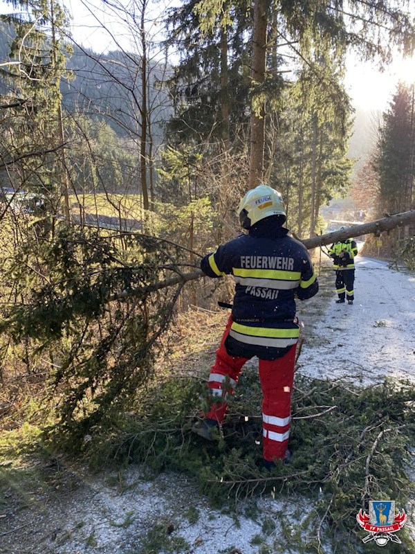 Tätigkeiten: Absichern der Einsatzstellen, Entfernen der Baumteile von der Straße, Reinigen der Fahrbahn