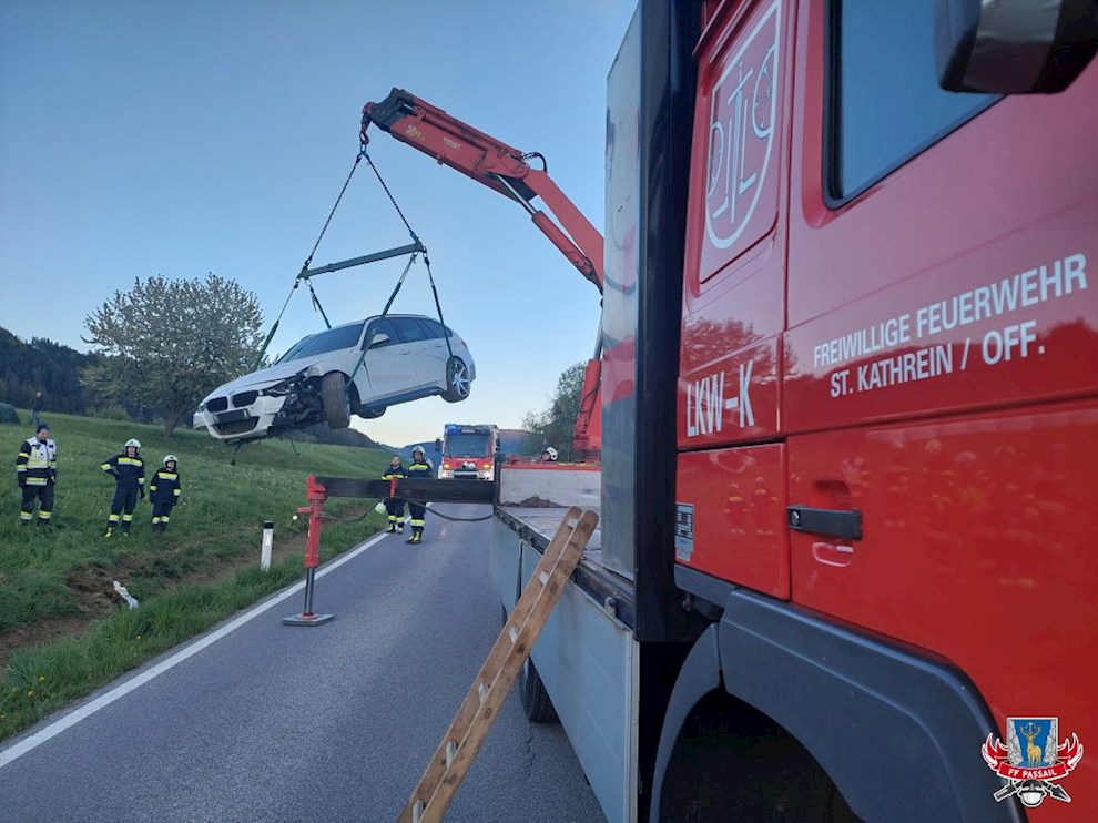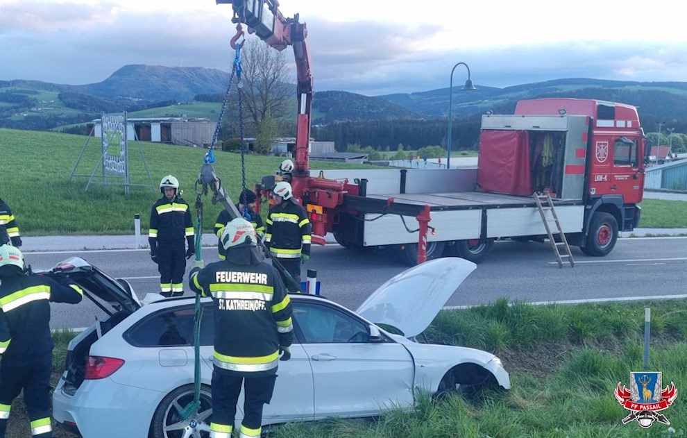 Grund der Alarmierung: Ein PKW kam von der Straße ab und steckte im Graben fest.