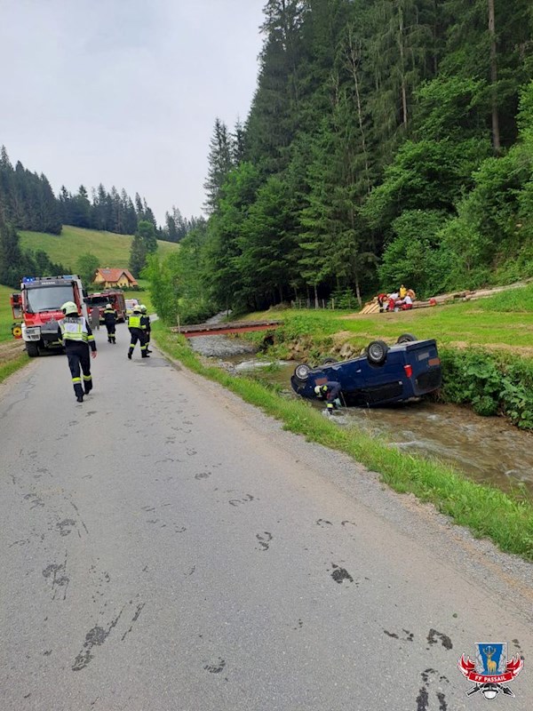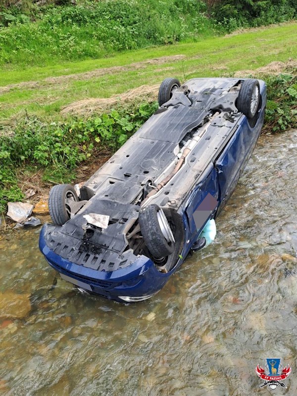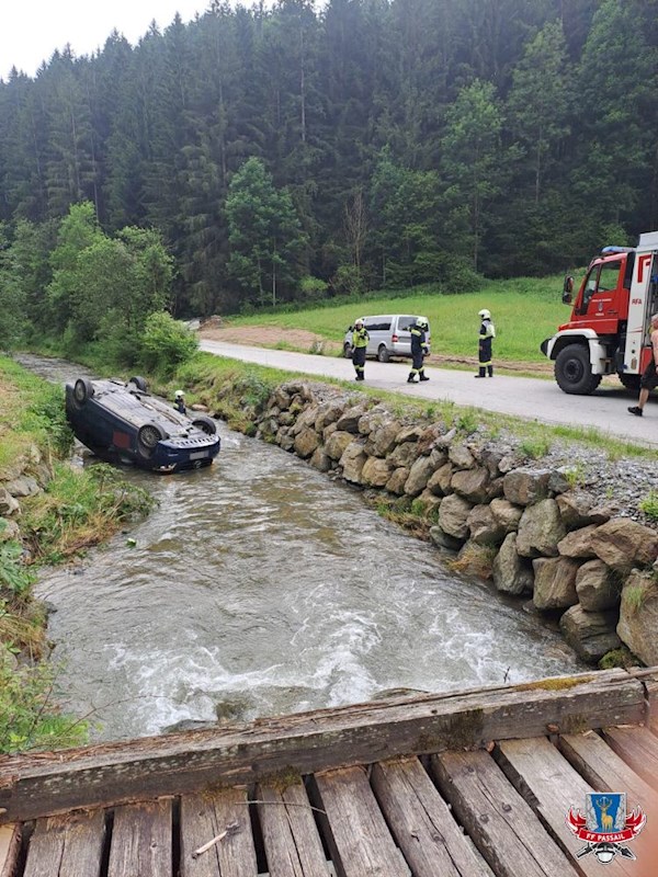 Grund der Alarmierung: Ein PKW kam von der Straße ab und kam im Bachbett der Raab am Dach zum Liegen.