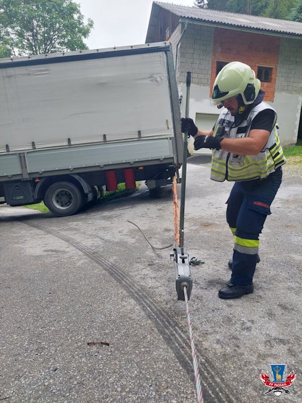 Tätigkeiten: Sichern des LKW gegen Wegrollen, Befreien des LKW durch seitliches Ziehen mittels Greifzug, Unterstützen beim Wenden