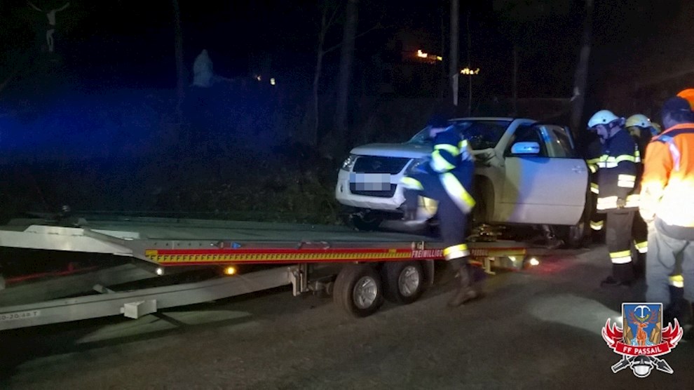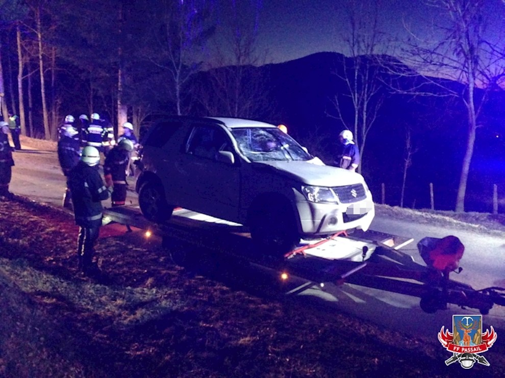 Tätigkeiten: Betreuen der verletzten Person und Übergabe an das Rote Kreuz, Ausleuchten der Unfallstelle, Aufstellen des PKW und mit Abschleppanhänger abtransportieren