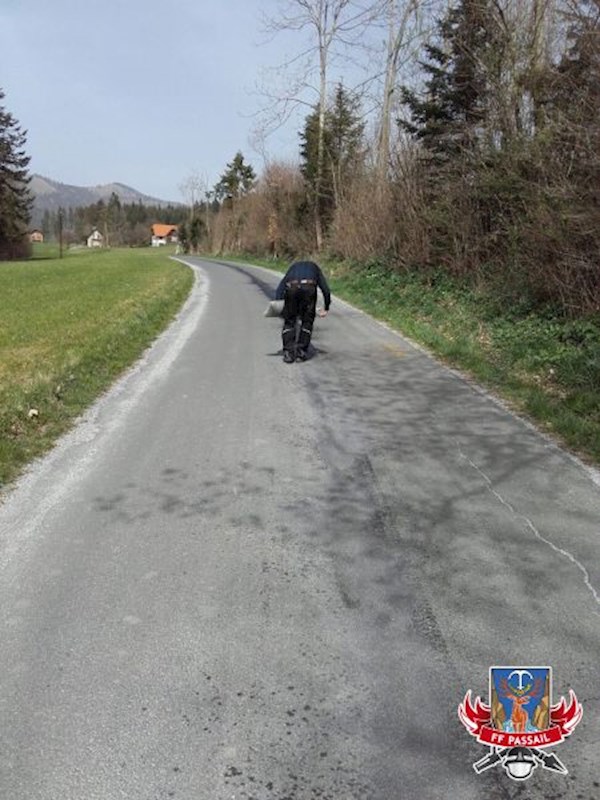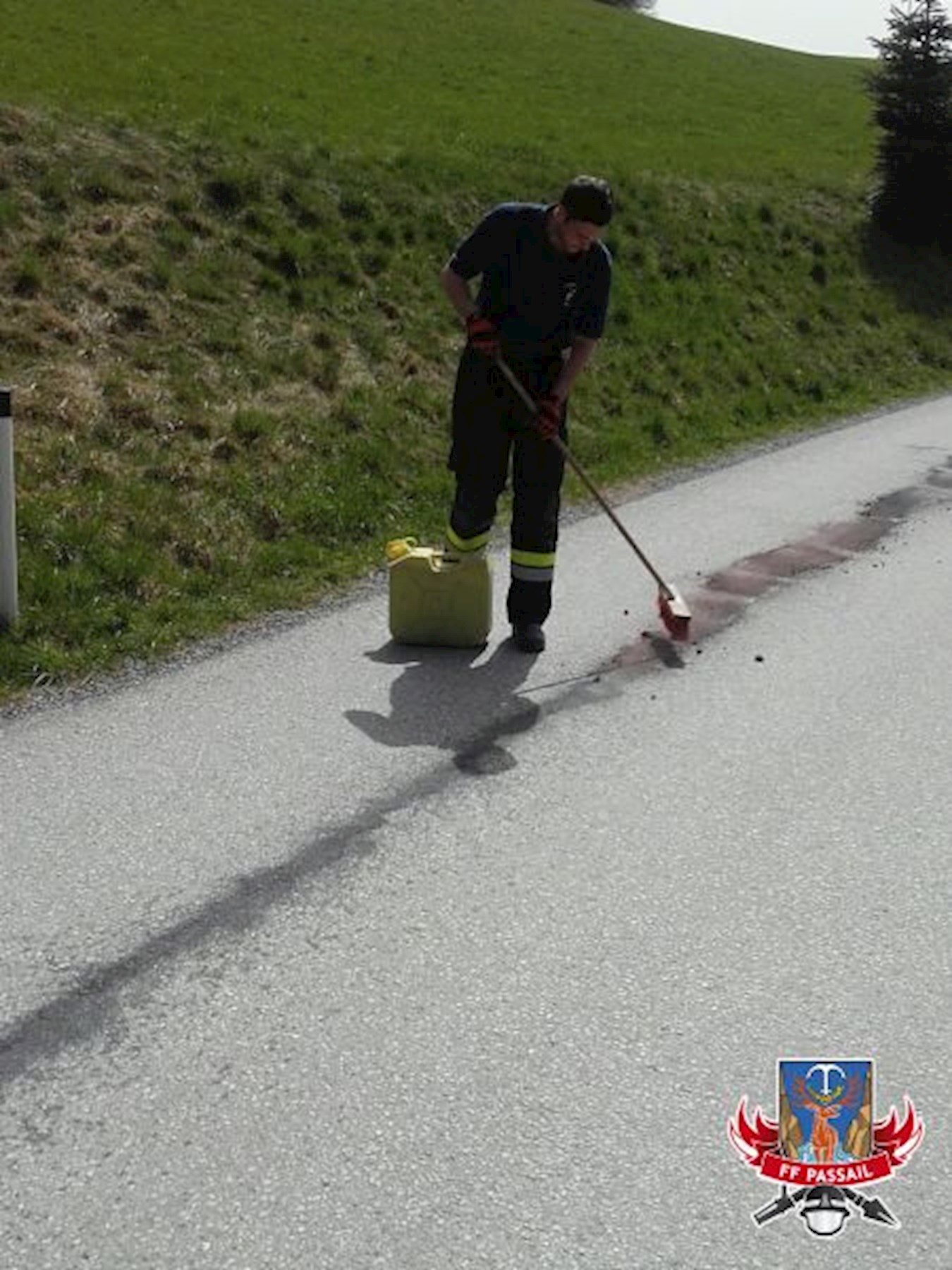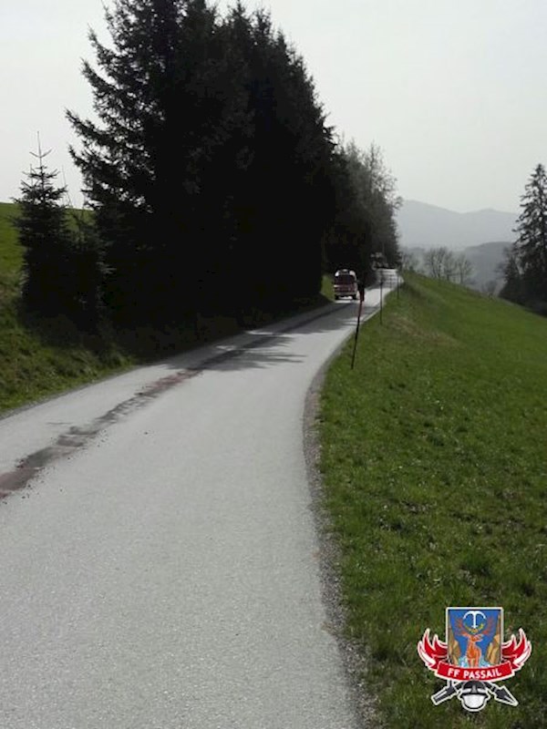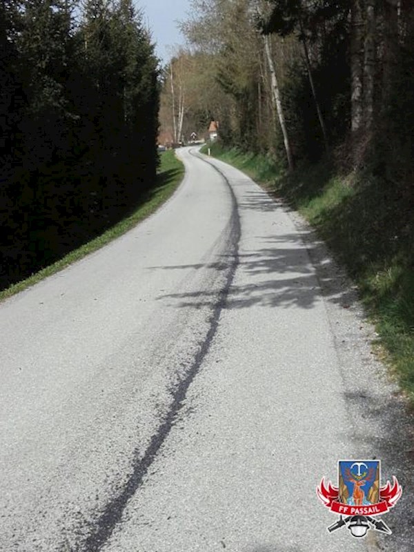 Am 5.4.2016 wurden wir um 12:27 Uhr per stillem Alarm zu Ölbindearbeiten gerufen. Ein geplatzter Hydraulikschlauch an der Lenkung eines Traktors war der Grund, weshalb eine etwa 700 m lange Ölspur gebunden werden musste. Auf der Strecke von der Lindenbergkirche bis zum Lukabauer wurden etwa 10 Säcke Ölbindemittel benötigt.