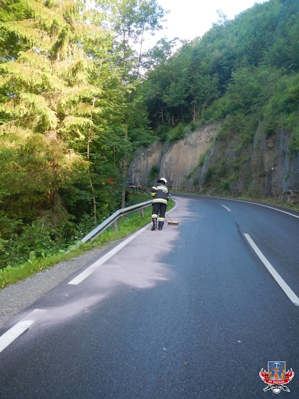 Tätigkeiten: Unfallstelle absichern, Verkehr regeln, PKW von der Böschung holen, ausgeflossenen Diesel binden, Fahrbahn reinigen und für den Verkehr freigeben