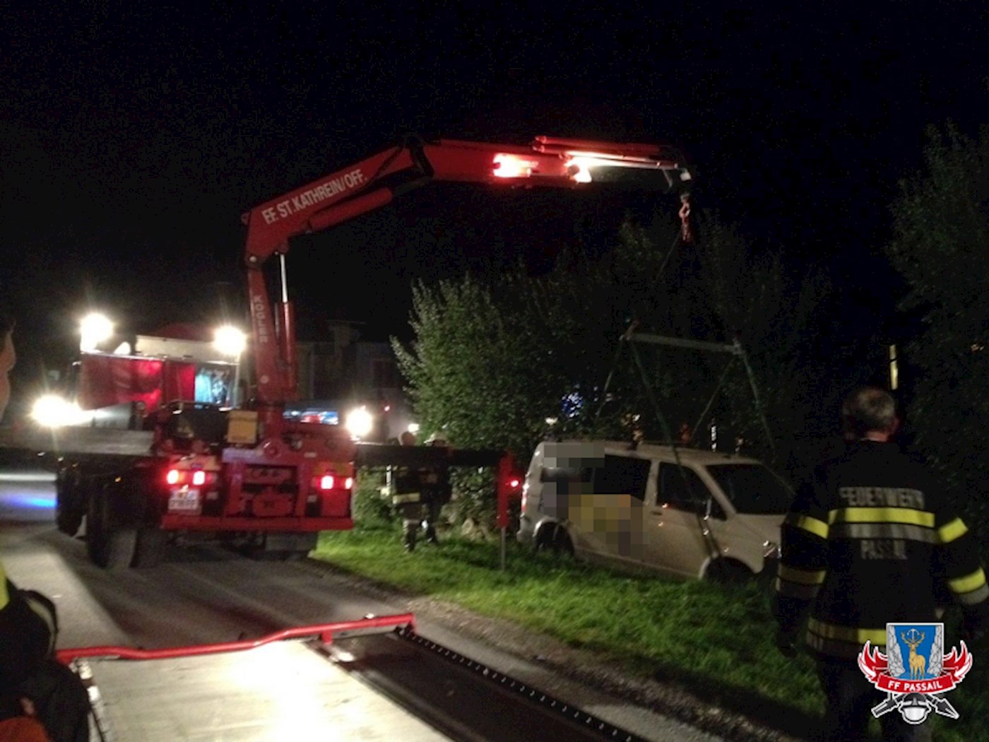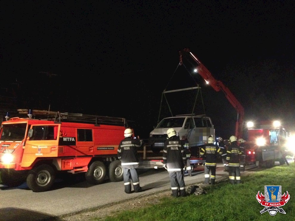 Tätigkeiten: Absichern und Ausleuchten der Unfallstelle, Kontrolle auf ausgelaufene Betriebsmittel, Bergen des Kleinbusses mittels Kran