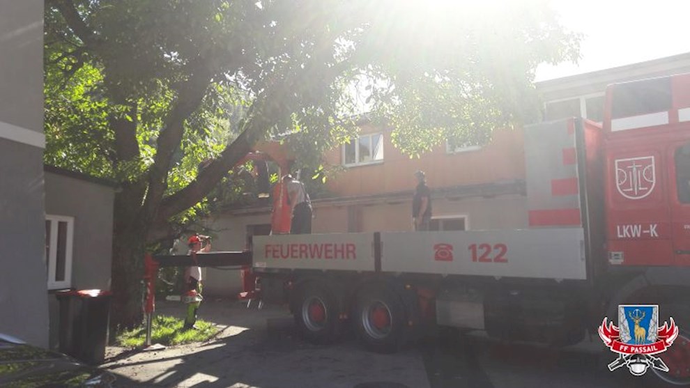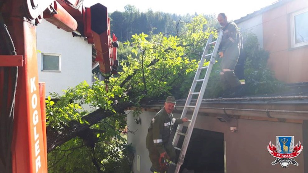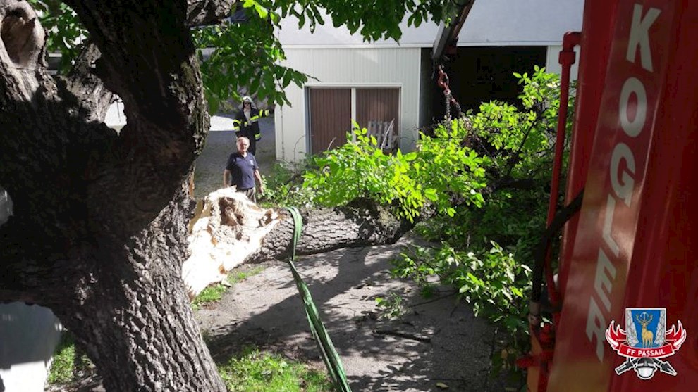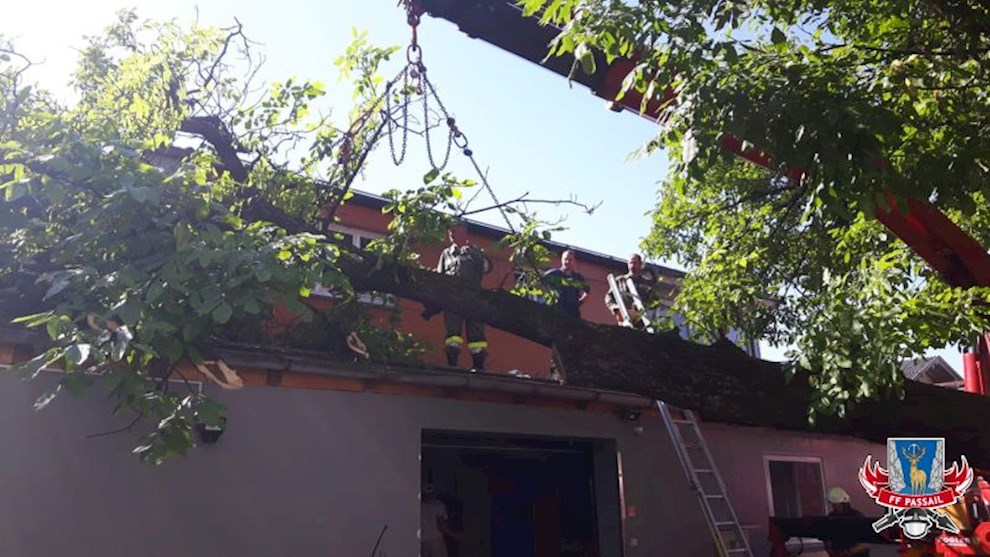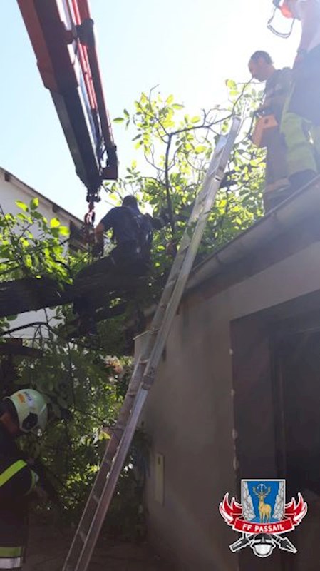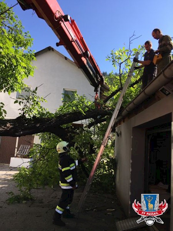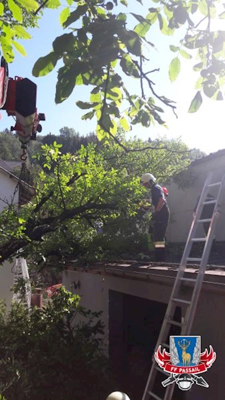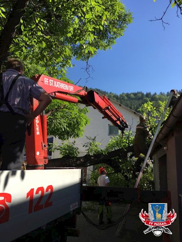 Am 20.7.2018 wurden wir um 8:18 Uhr per stillem Alarm zu einer Baumbergung in die Weizer Straße alarmiert. Die Erstmeldung lautete, dass ein Baum auf einen LKW gestürzt ist. Bei der Erkundung stellte sich jedoch heraus, dass der LKW einen Ast übersah und diesen rammte. Der Ast fiel danach auf das Gebäude daneben.