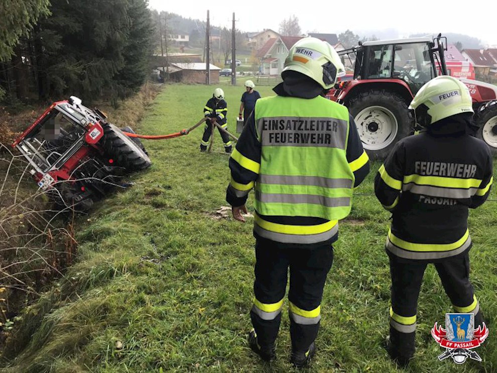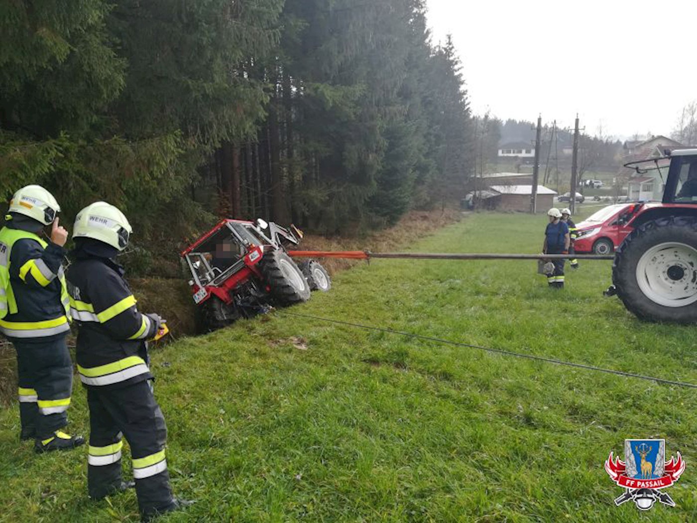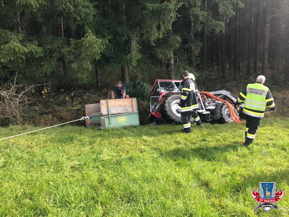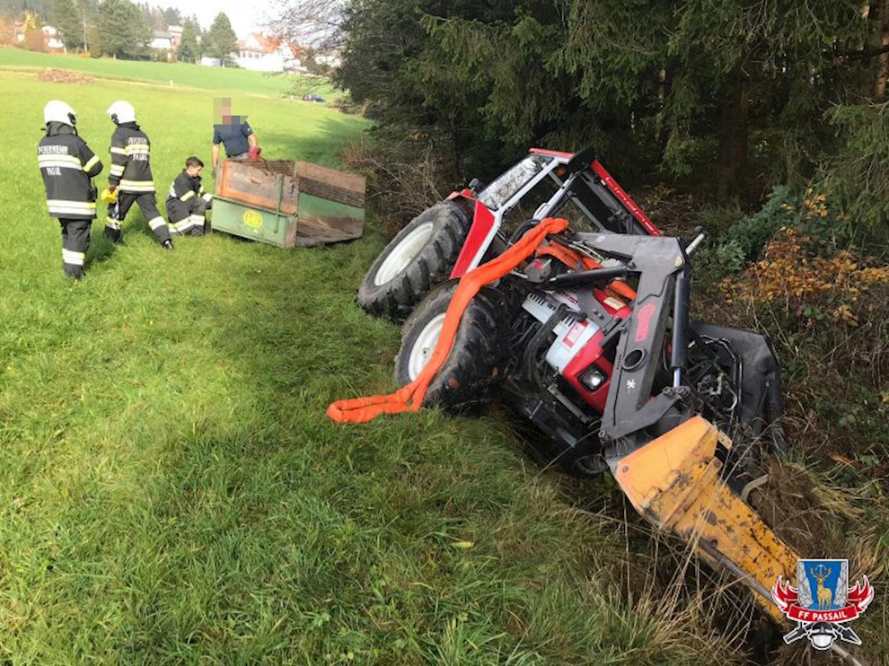 Tätigkeiten: Bergen des Traktors mittels Seilwinde, Sichern des Fahrzeuges