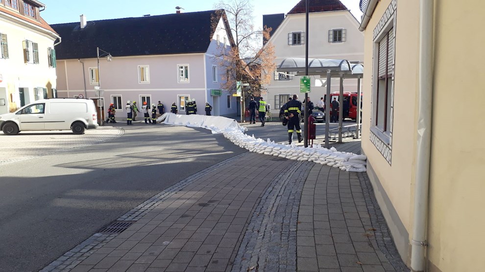 - Schutz des Hauptplatzes Passail durch Errichtung einer rd. 50 Meter langen Sandsackbarriere