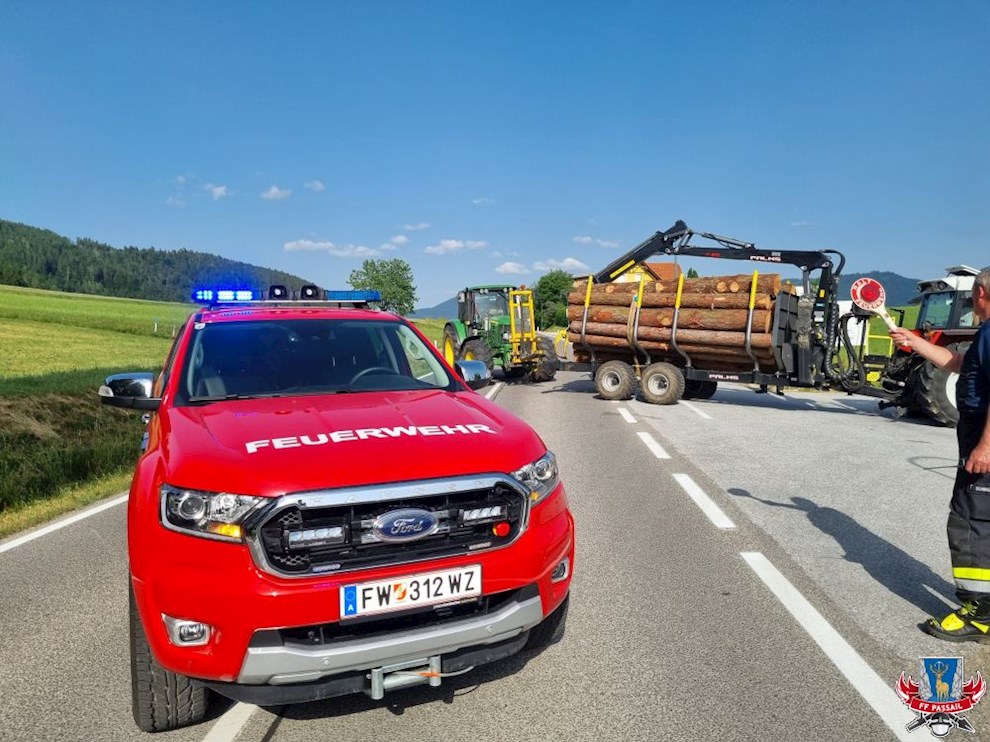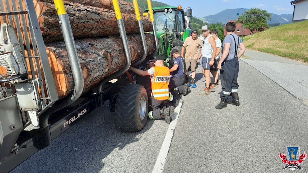 Grund der Alarmierung: Reifenplatzer bei einem beladenen Forstanhänger