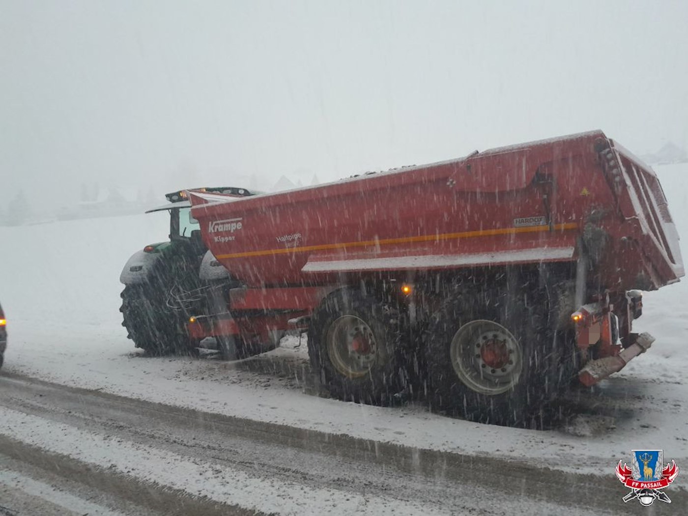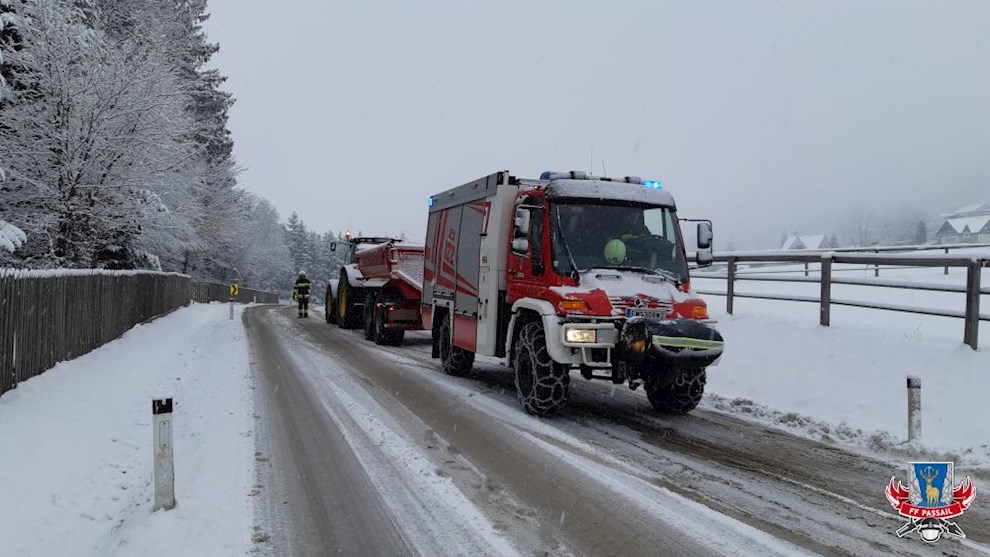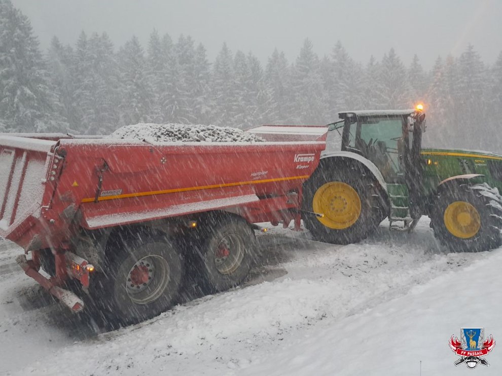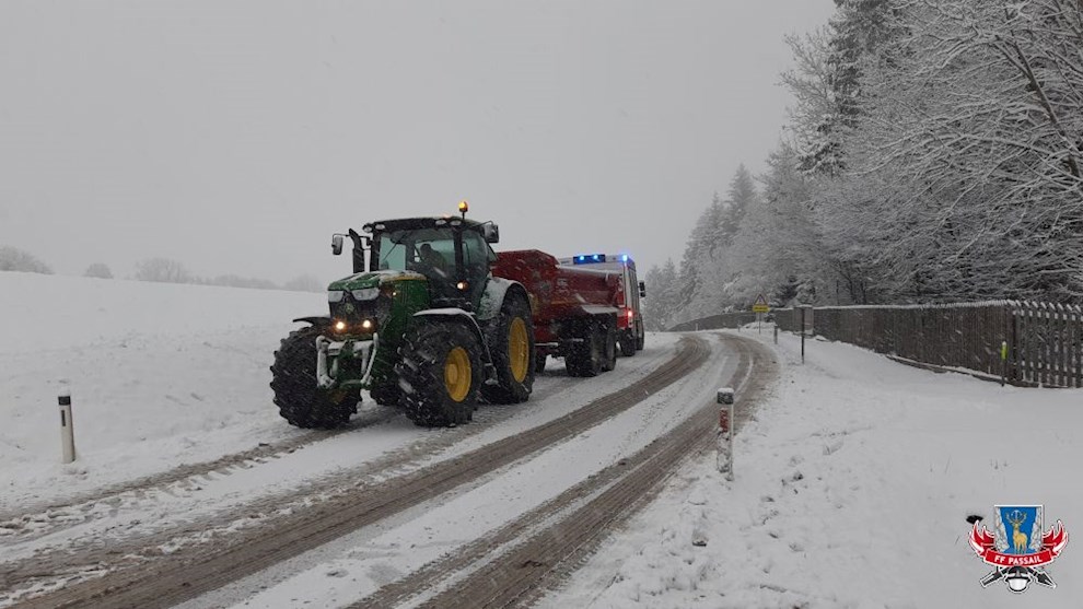 Grund der Alarmierung: Ein Traktorgespann ist durch die rutschigen Fahrverhältnisse von der Fahrbahn abgekommen.