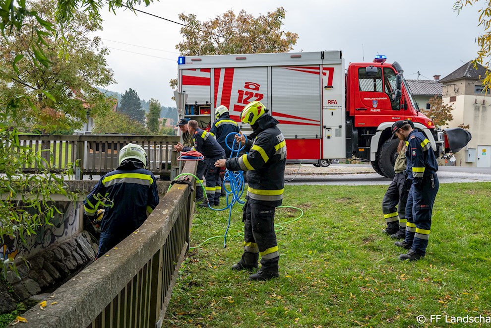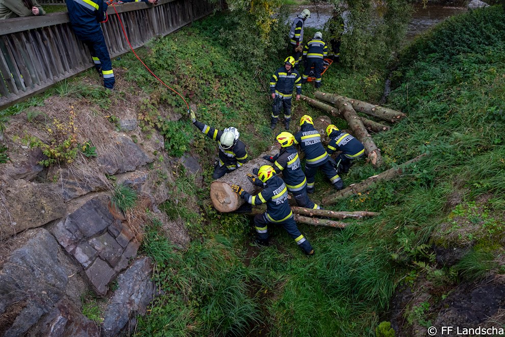 Unsere Aufgabe bestand aus dem Abarbeiten zweier Übungsszenarien. Unter der Führung von Zugskommandant ABI Christian Lechner wurden gemeinsam mit den Feuerwehren Rollsdorf und Landscha zwei unter Holzbloche im Raasbach eingeklemmte Personen befreit und im Anschluss diese Bloche mit dem SRF Weiz geborgen.