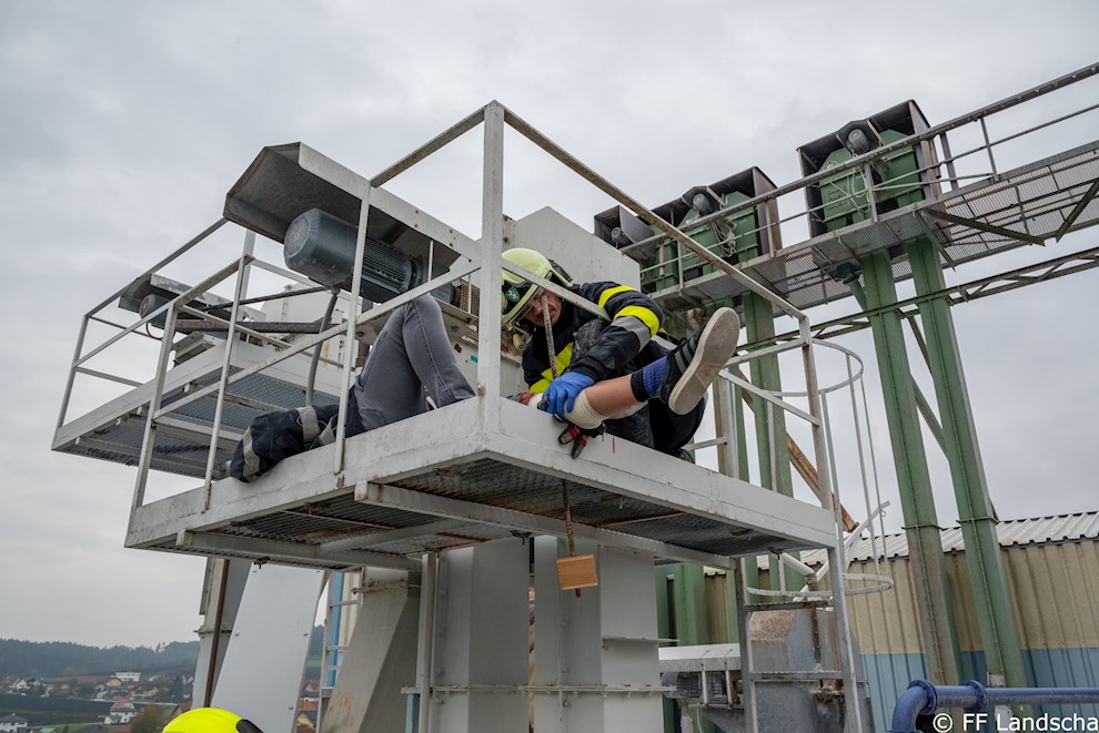 Im zweiten Übungsszenario im Werksgelände der Firma Imerys Talc Austria mussten 3 verletzte Personen vom Dach im 3. und 4. Stock erstversorgt, mit verschiedenen Rettungsgeräten gerettet und anschließend über das Stiegenhaus zum Übergabeort gebracht werden.