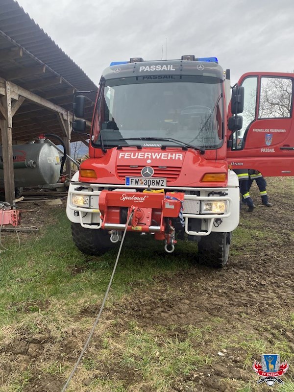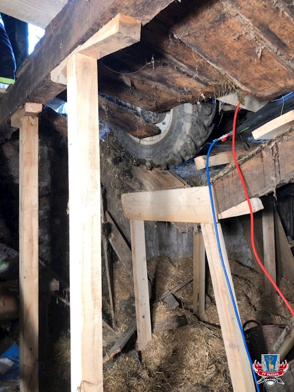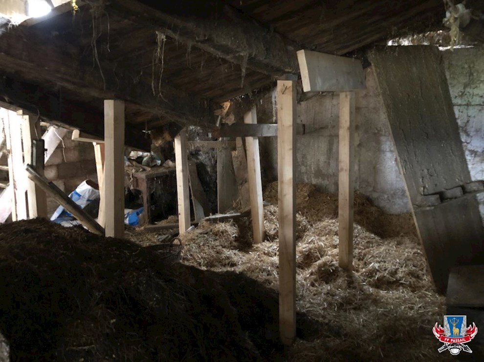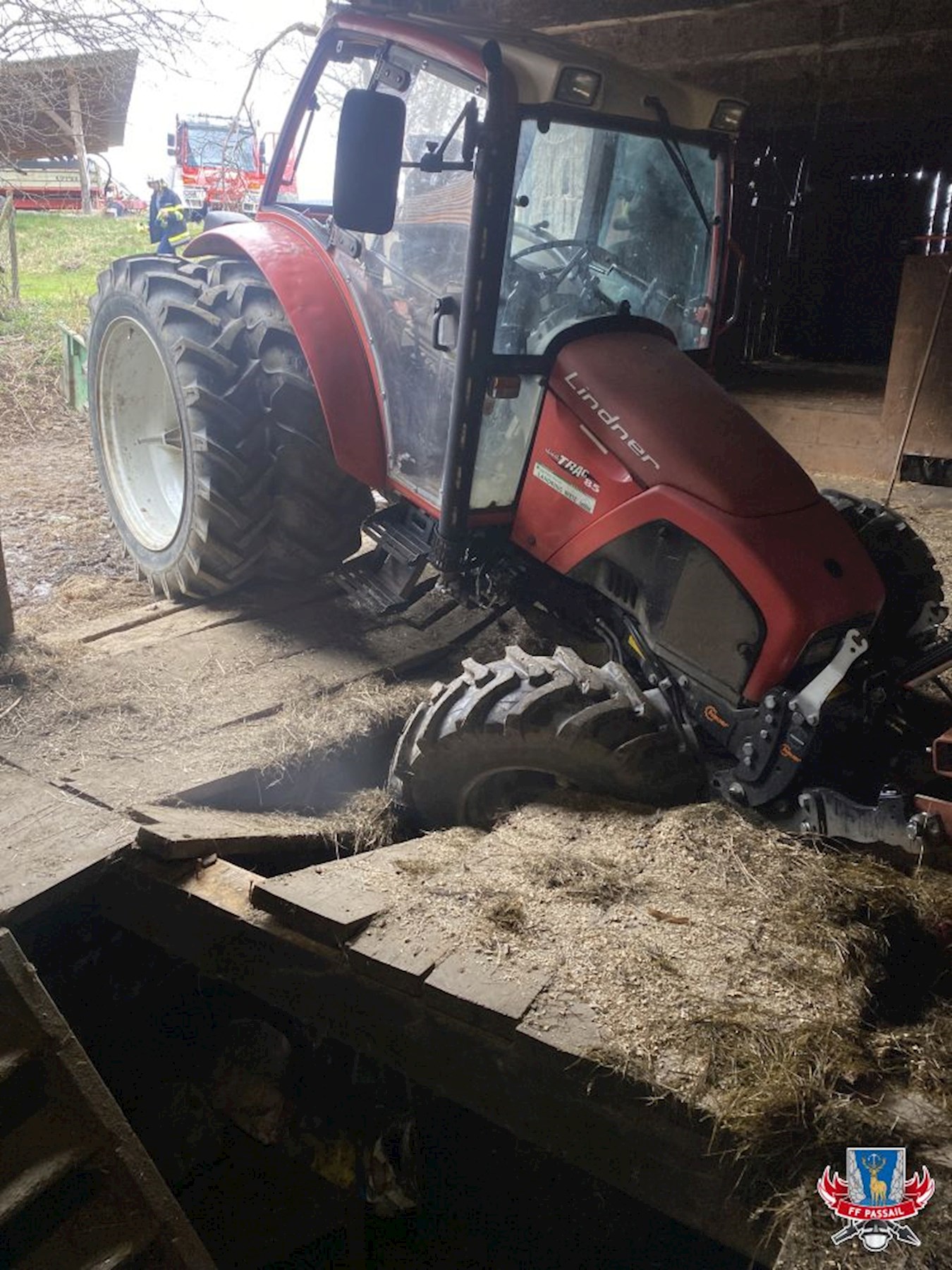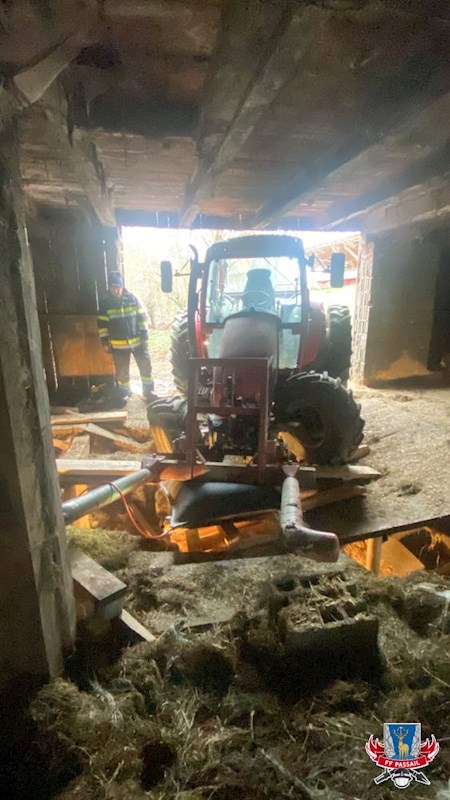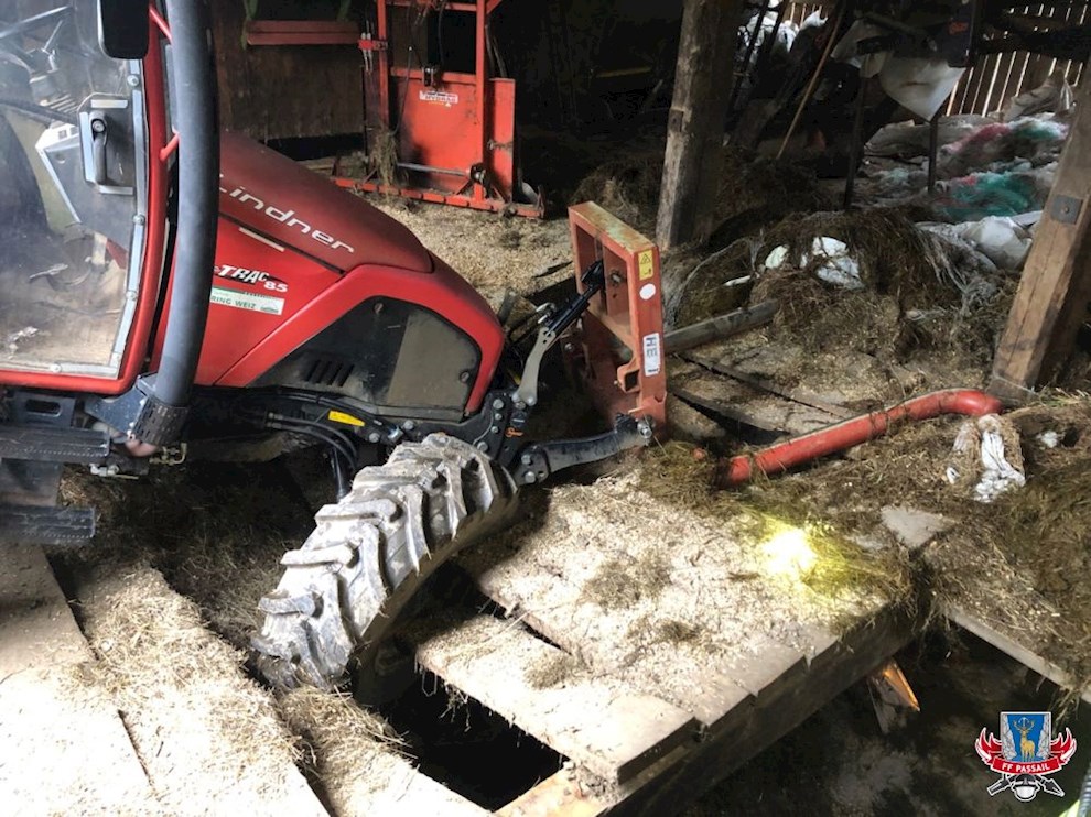 Grund der Alarmierung: Ein Traktor brach in die Holzdecke eines Stallgebäudes ein.