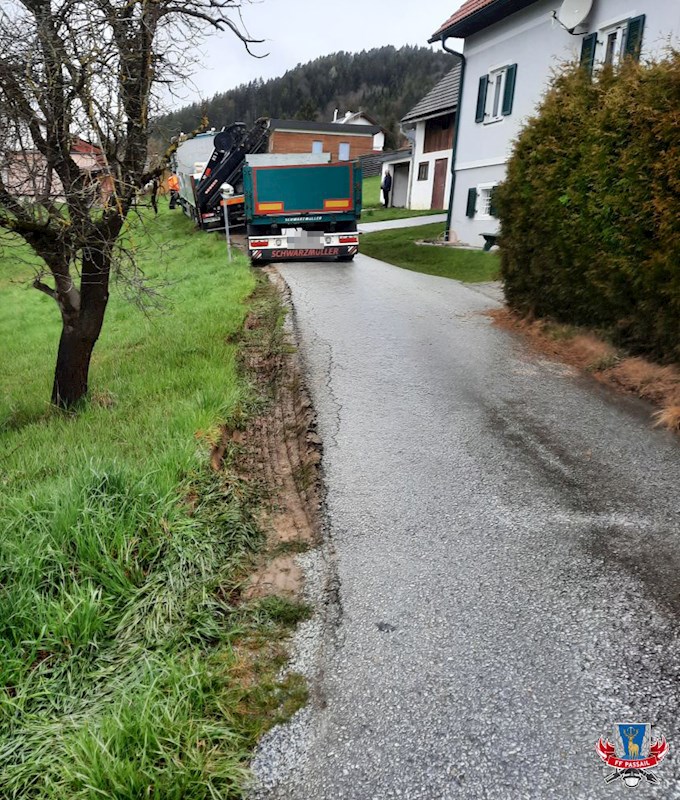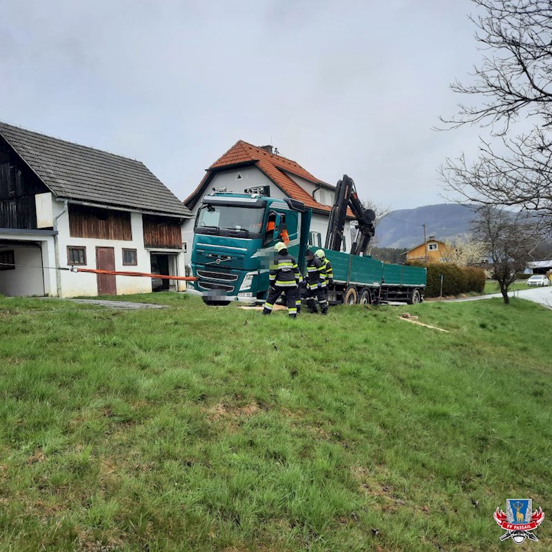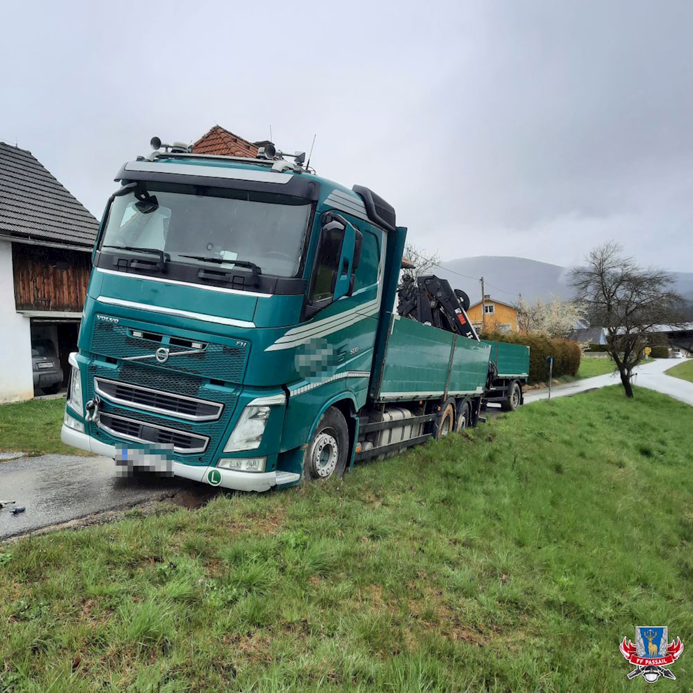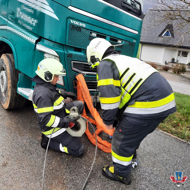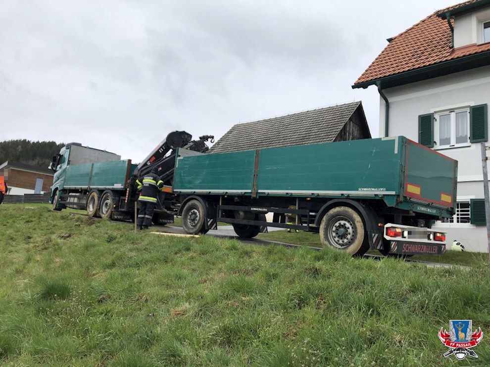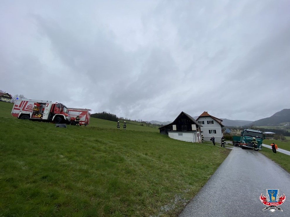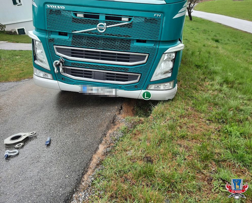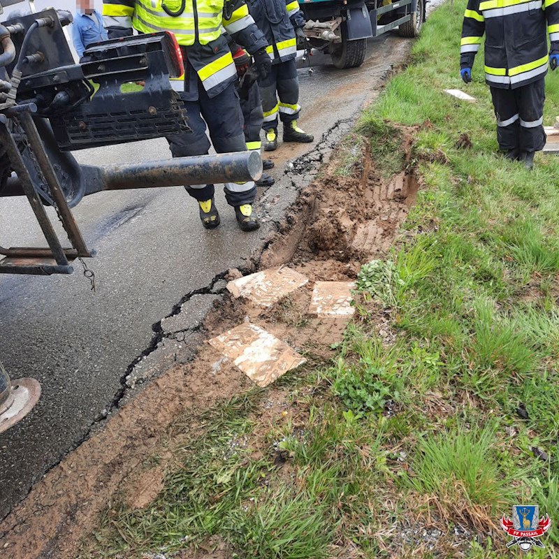 Grund der Alarmierung: Ein mit Pflastersteinen beladener LKW kam von einer schmalen Straße ab und blieb im Bankett stecken.