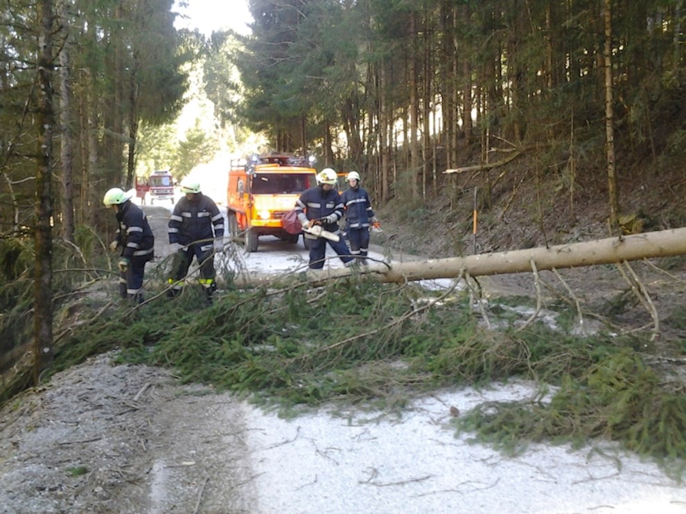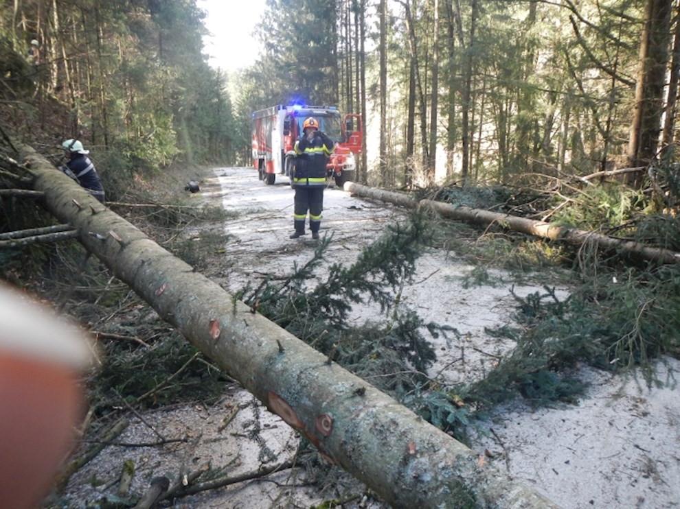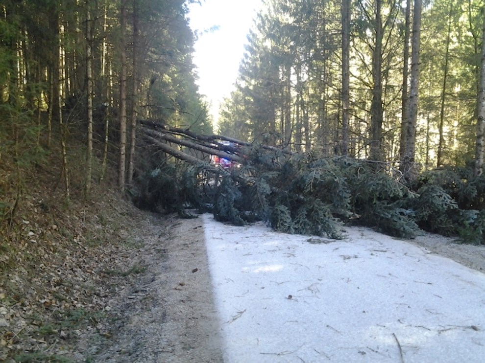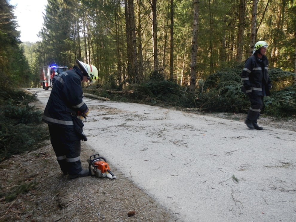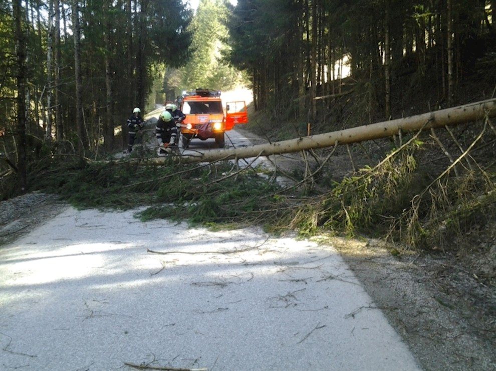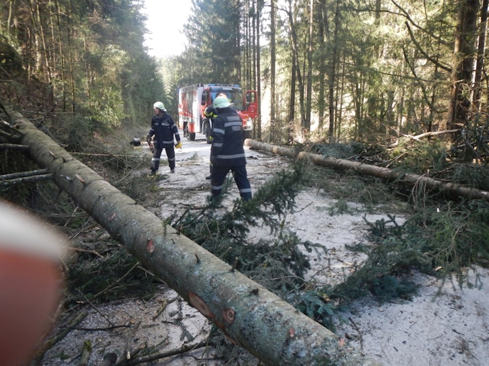 Die Straße beim GH Sperl konnte wieder freigemacht werden. Das Freischneiden der anderen war wegen der vielen umgestürzten Bäume und des noch starken Windes zu gefährlich und deshalb musste sie gesperrt werden.