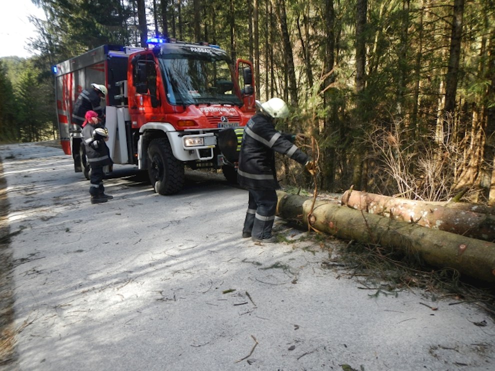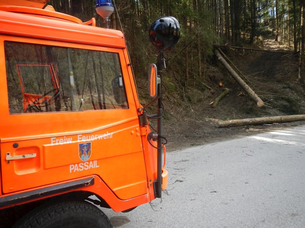 Mehrere Bäume blockieren die Straße im Bereich GH Sperl von Haufenreith kommend, sowie die Straße von Passail nach Arzberg (Alte Arzbergerstraße).