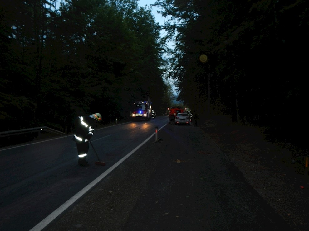 Ein PKW war gegen einen umgefallenen Baum gefahren und verlor Betriebsmittel.