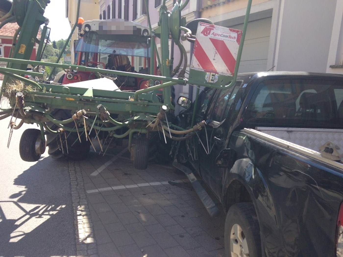 Ein Traktor fuhr zu schnell um die Kurve Höhe Hohenauer Versicherung, sodass der Fahrer das Fahrzeug nicht so schnell wieder gerade lenken konnte. Er krachte dadurch in ein parkendes Auto und beschädigte dieses auf der Fahrerseite. Zu diesem Zeitpunkt war keine Person im Auto.