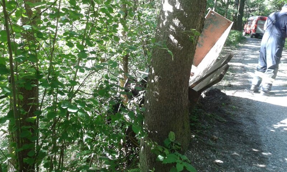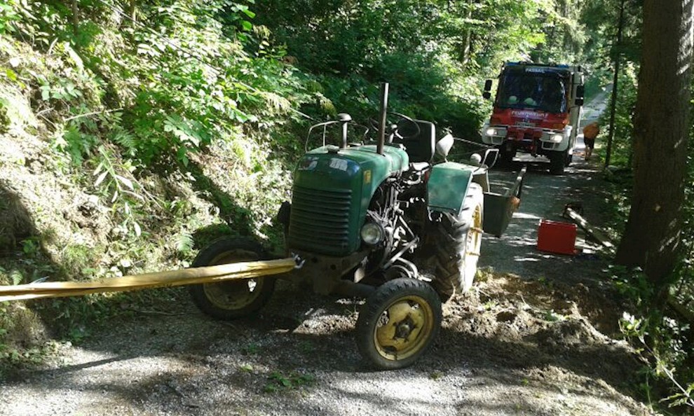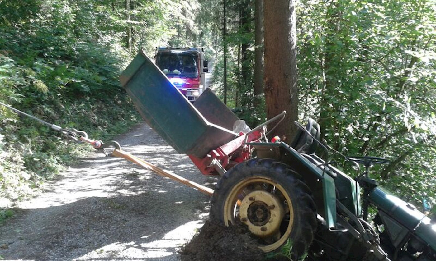 Ein Traktor ist von einem Schotterweg abgekommen und im steilen Gelände an einem Baum hängen geblieben. Der Fahrer konnte rechtzeitig vom Fahrzeug abspringen.