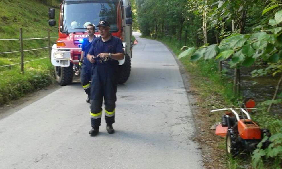 Tätigkeiten: Bergen des Traktors mittels Seilwinde des RFA und des abgestürzten Balkenmähers, Zustellen an den Besitzer