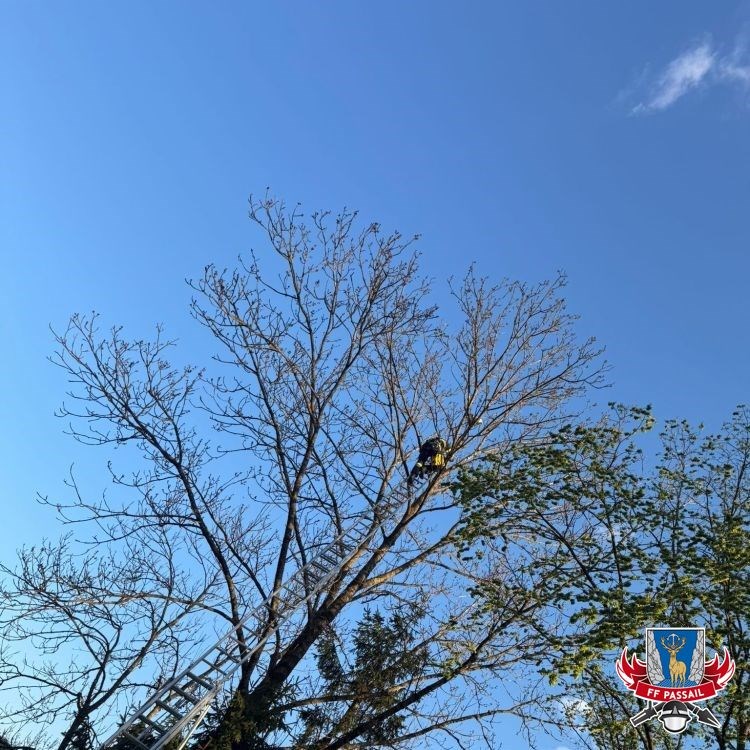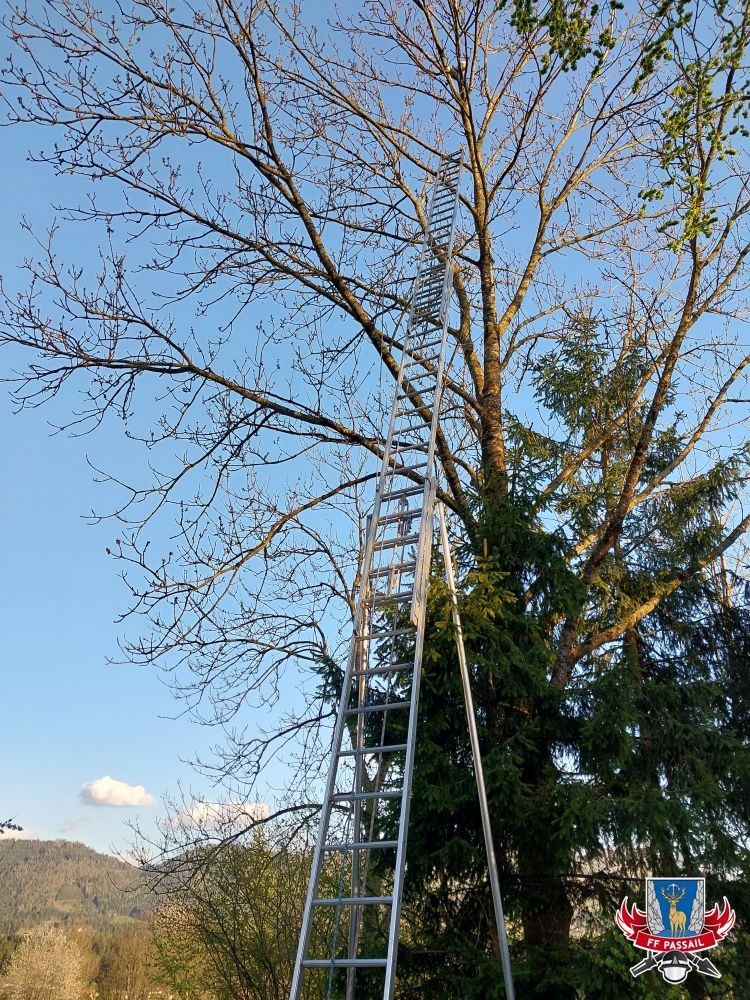 Grund der Alarmierung: Eine Katze sitzt auf ca. 17 Meter Höhe auf einem Baum fest.