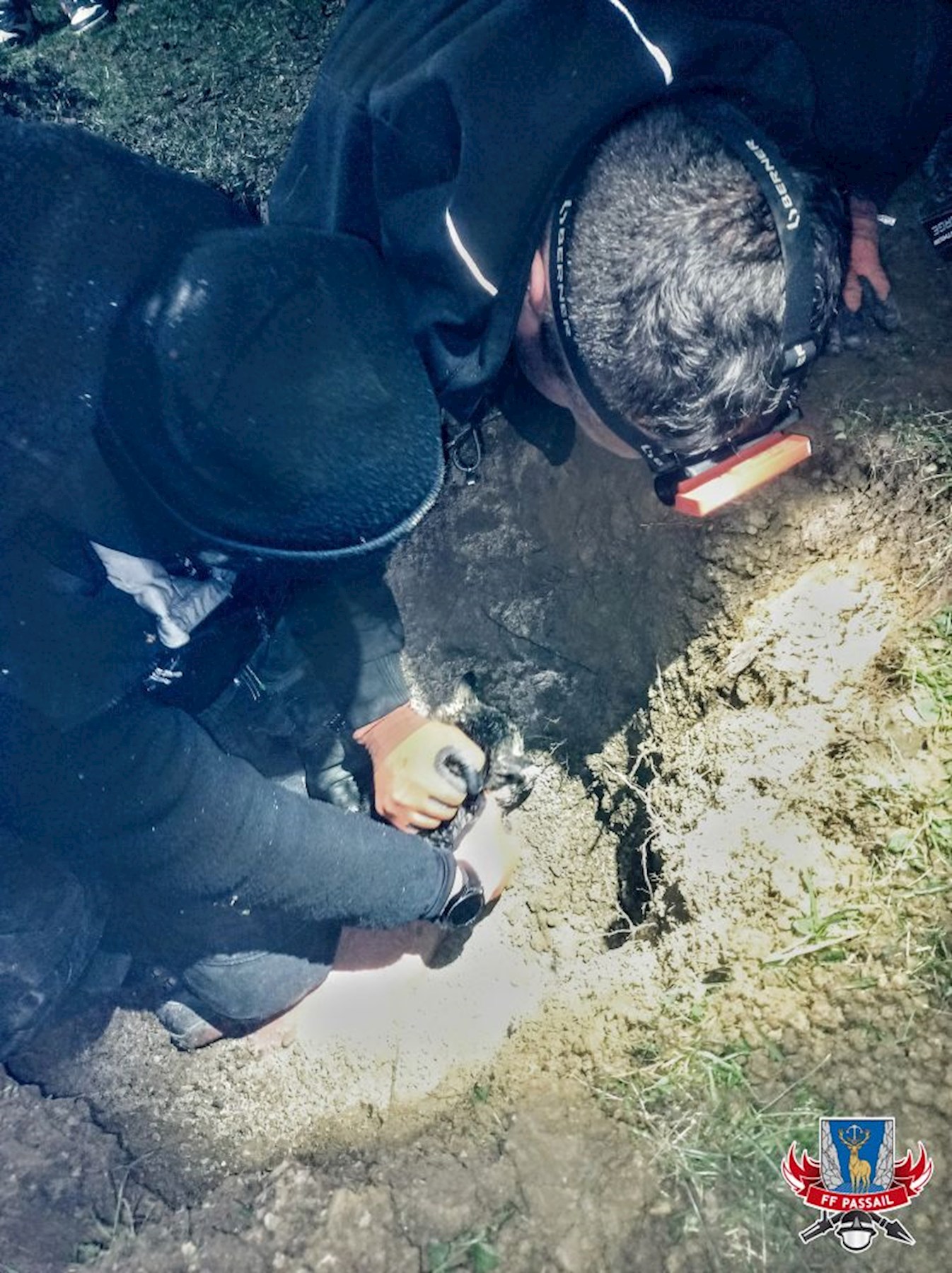 Tätigkeiten: Absichern und Ausleuchten der Einsatzstelle, Kontrollieren des Bereichs mittels Rohrkamera, Befreien der Katze durch Ausgraben des Rohres