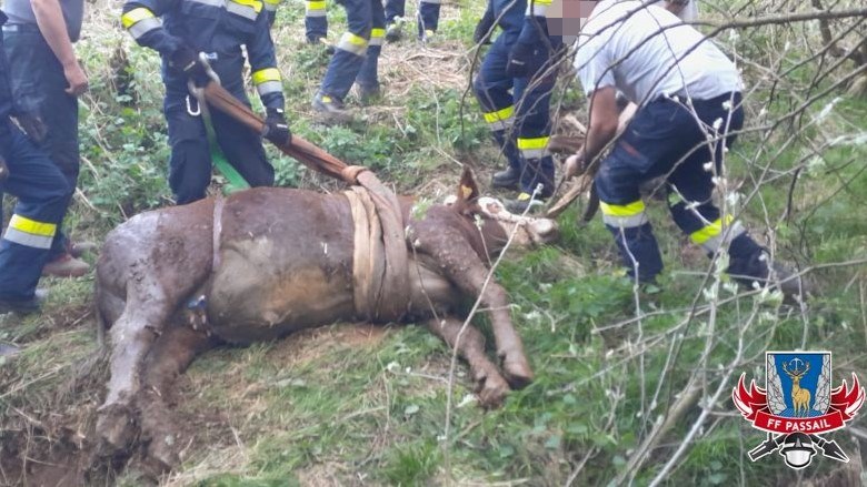Grund der Alarmierung: Ein Kalb stürzte in einen Wassergraben und konnte sich nicht mehr selbst befreien.